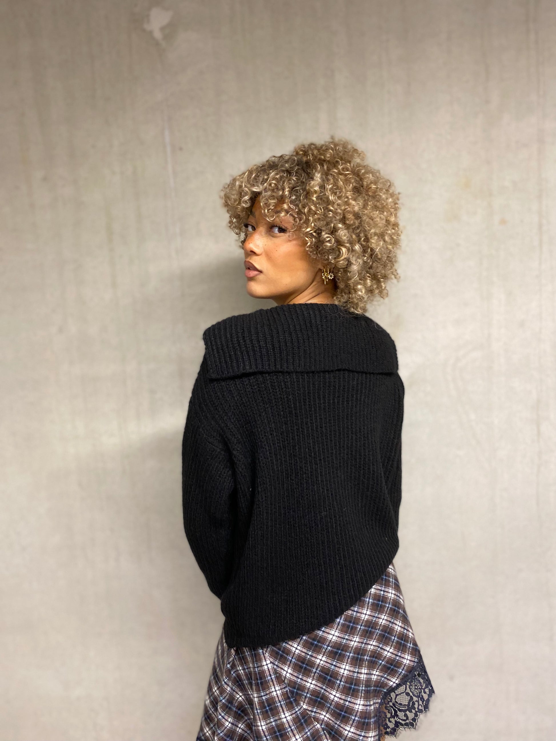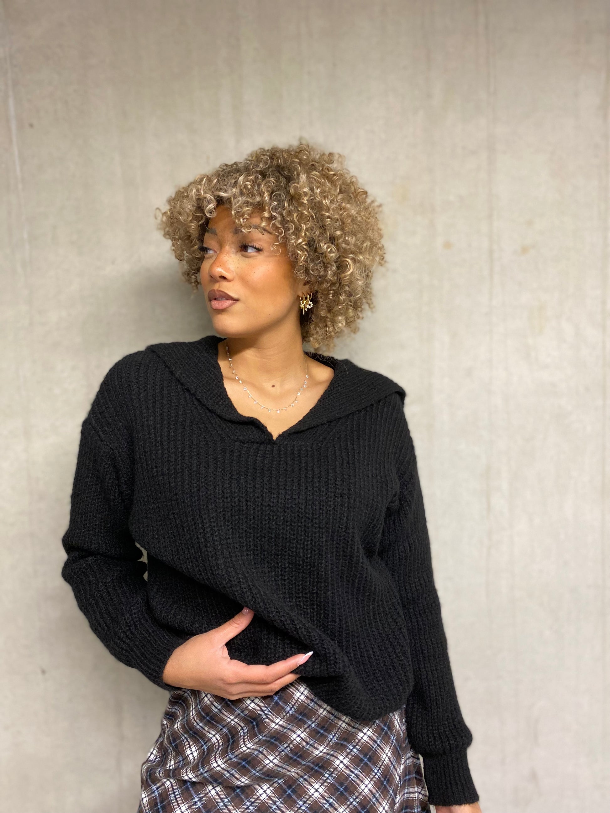 Pull noir manches longues, coupe droite avec un col V et l'arrière carré