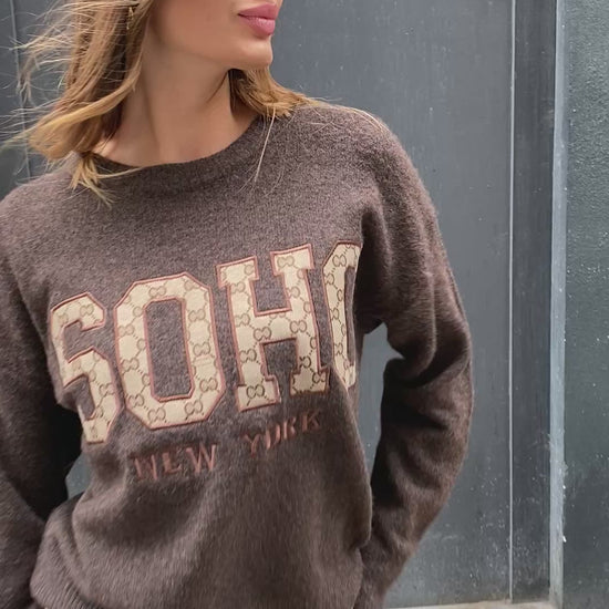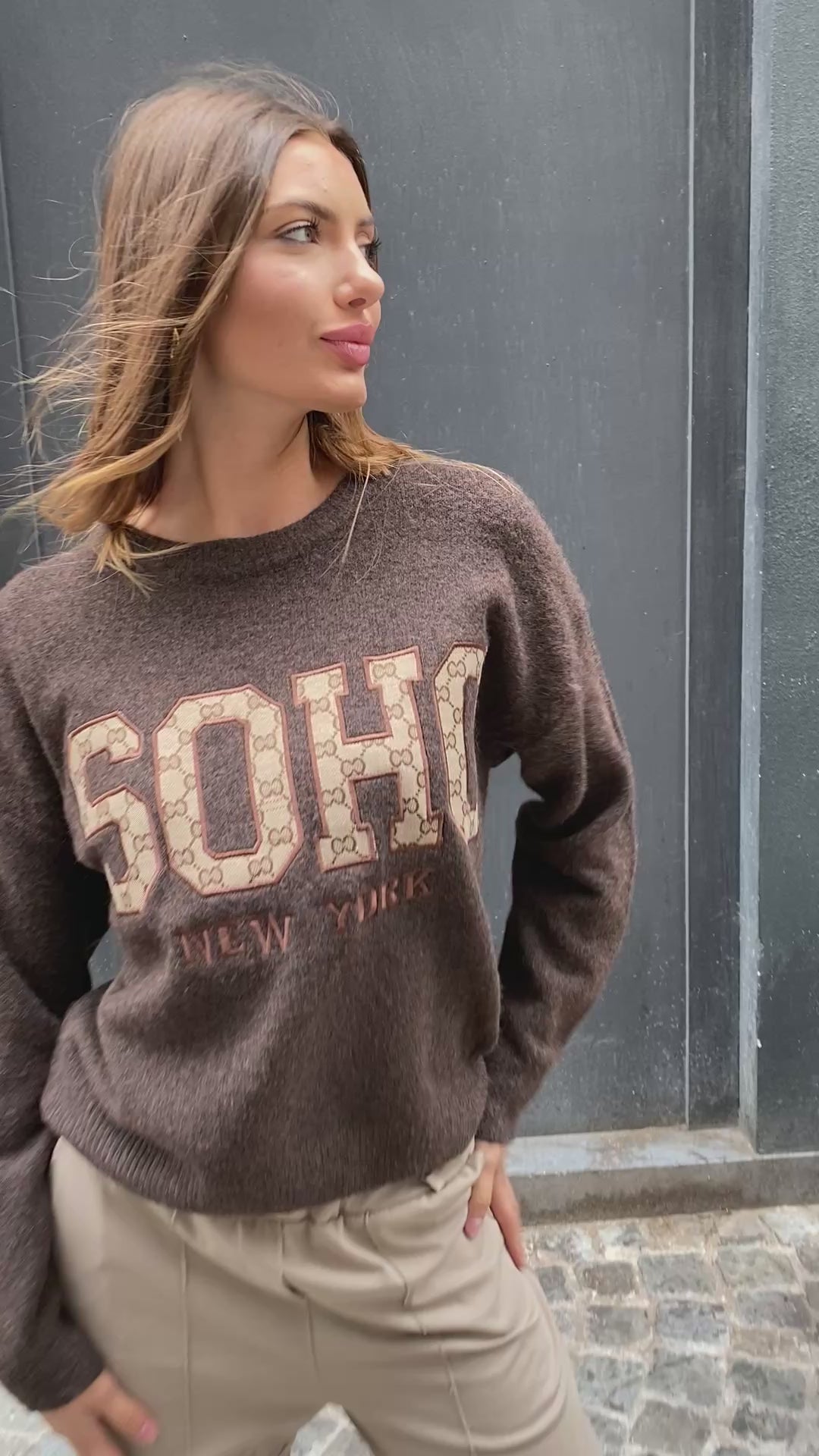 Pull brun avec le col arrondi manches longues avec une inscription SOHO