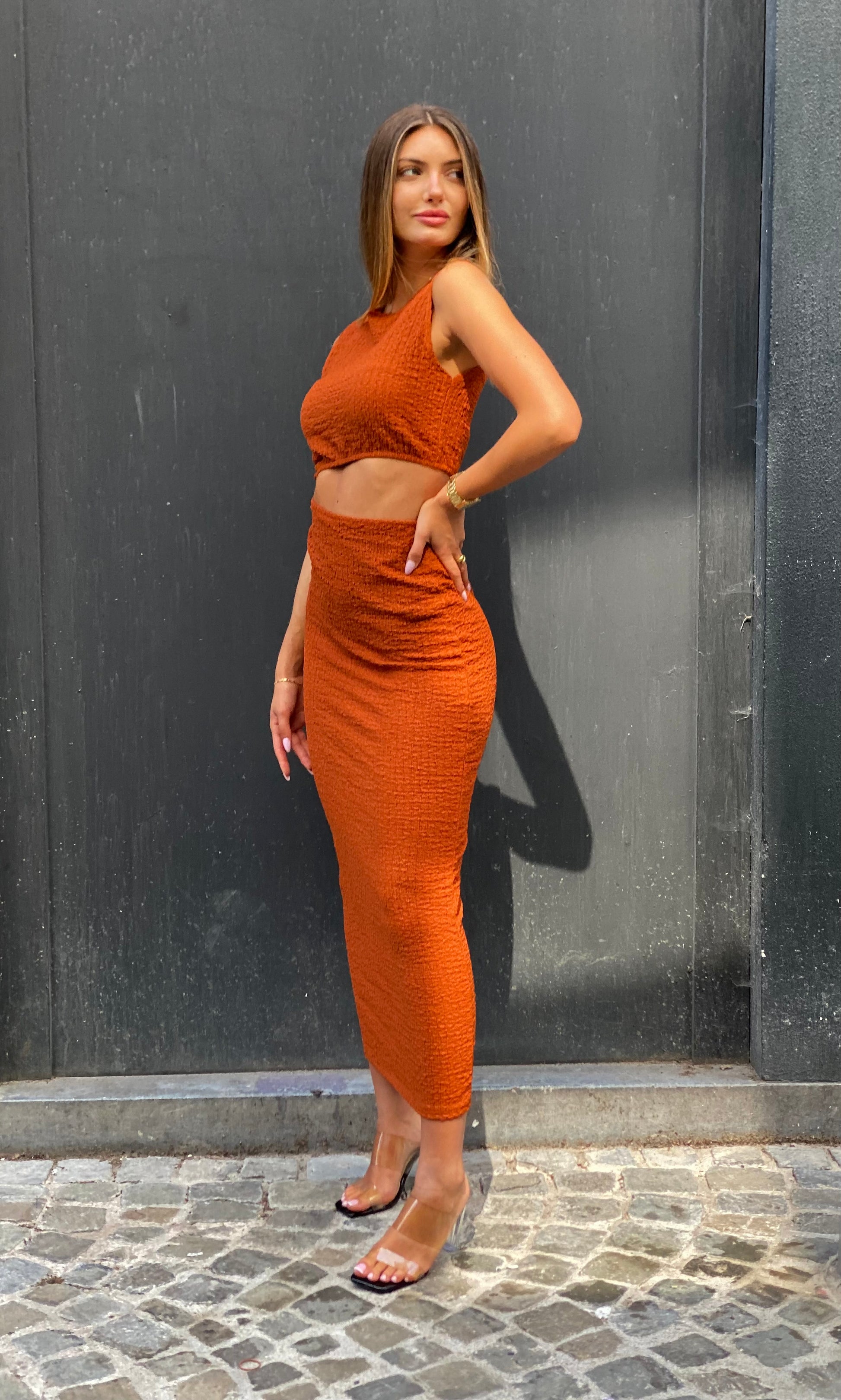 Robe en deux partie relié matière gaufrée qui laisse la taille et le ventre apparent