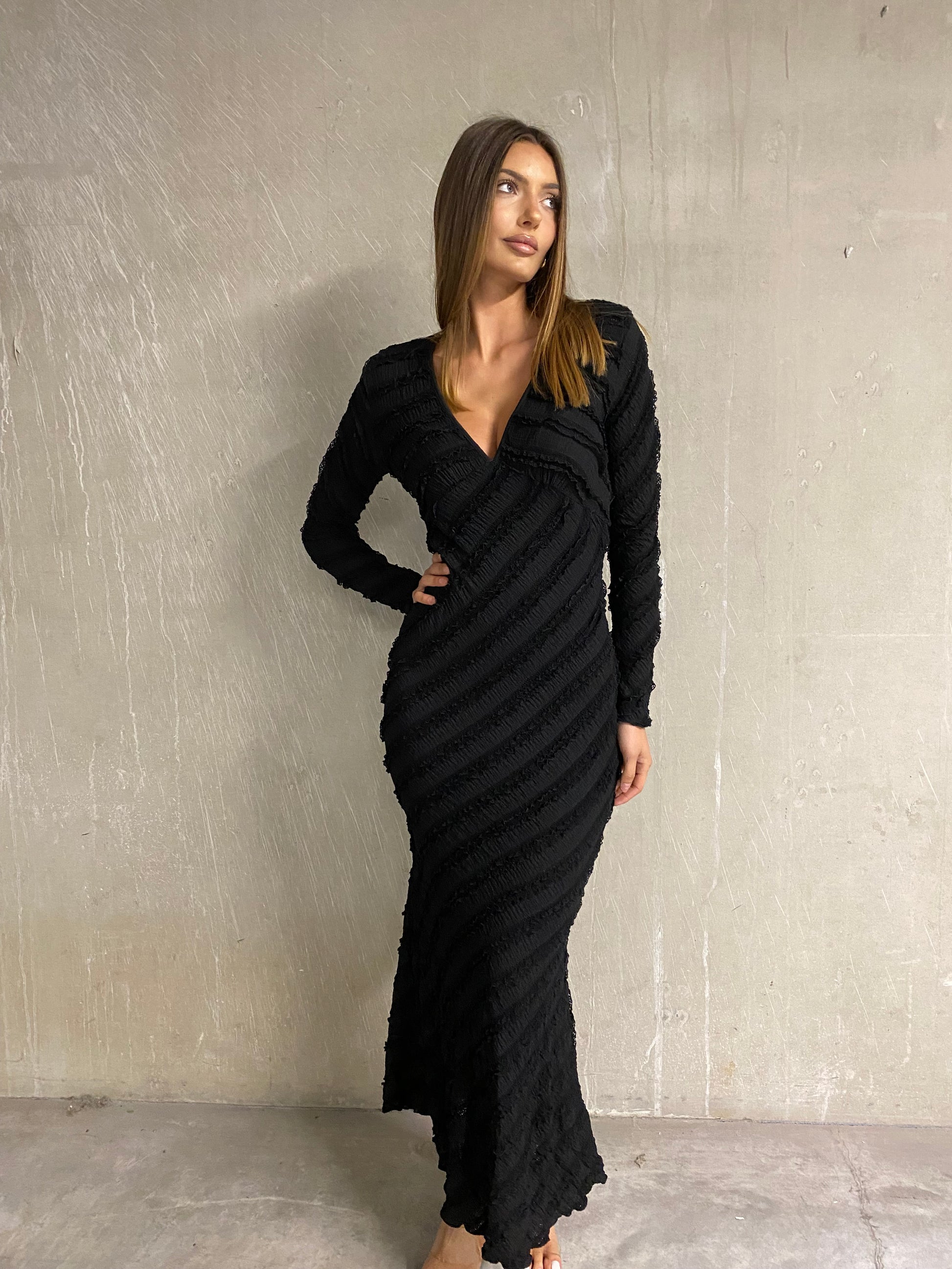 Robe sirène avec des manches longues à grand Colvez, bien cintré au niveau de la taille, et ce termine avec le bas. Un peu évasé, matière très extensible avec un petit relief dans le tissu en oblique, ce qui donne vraiment une silhouette bien galbé et affiner.