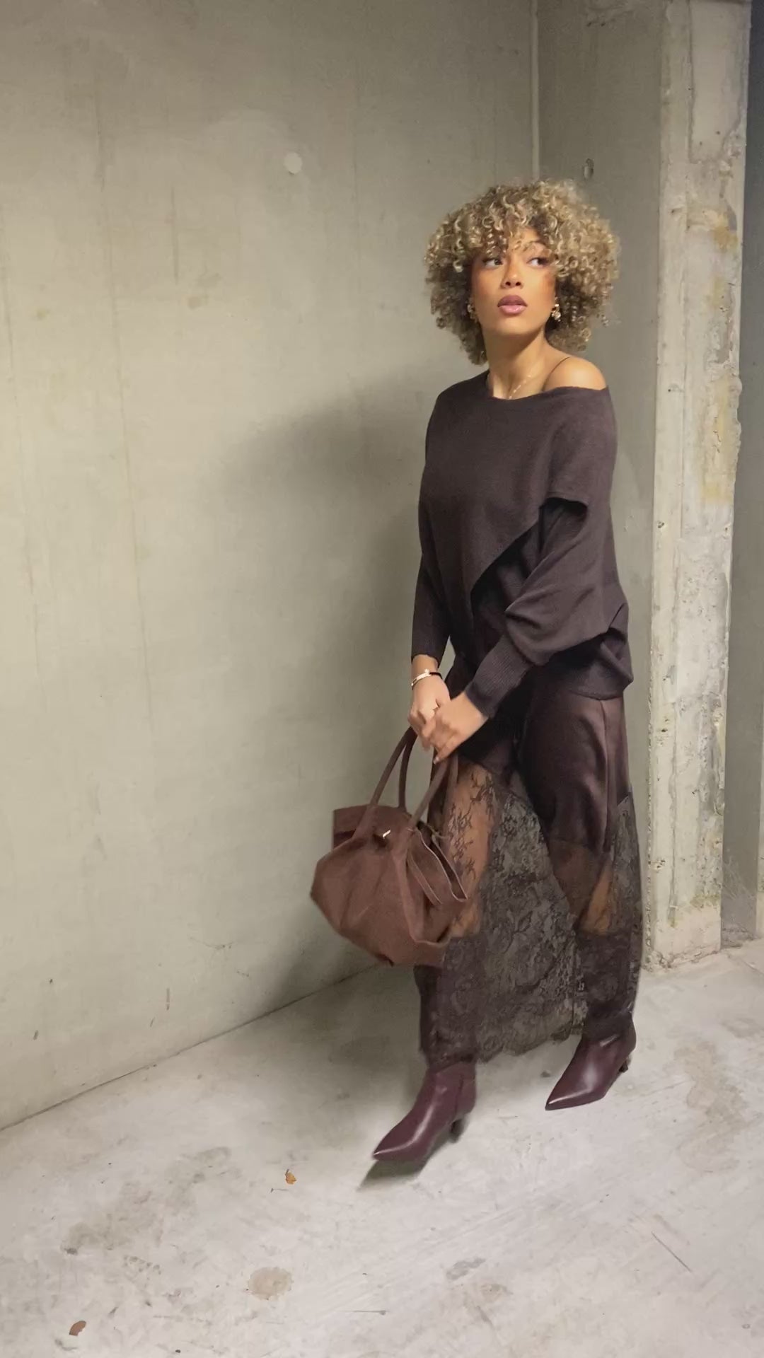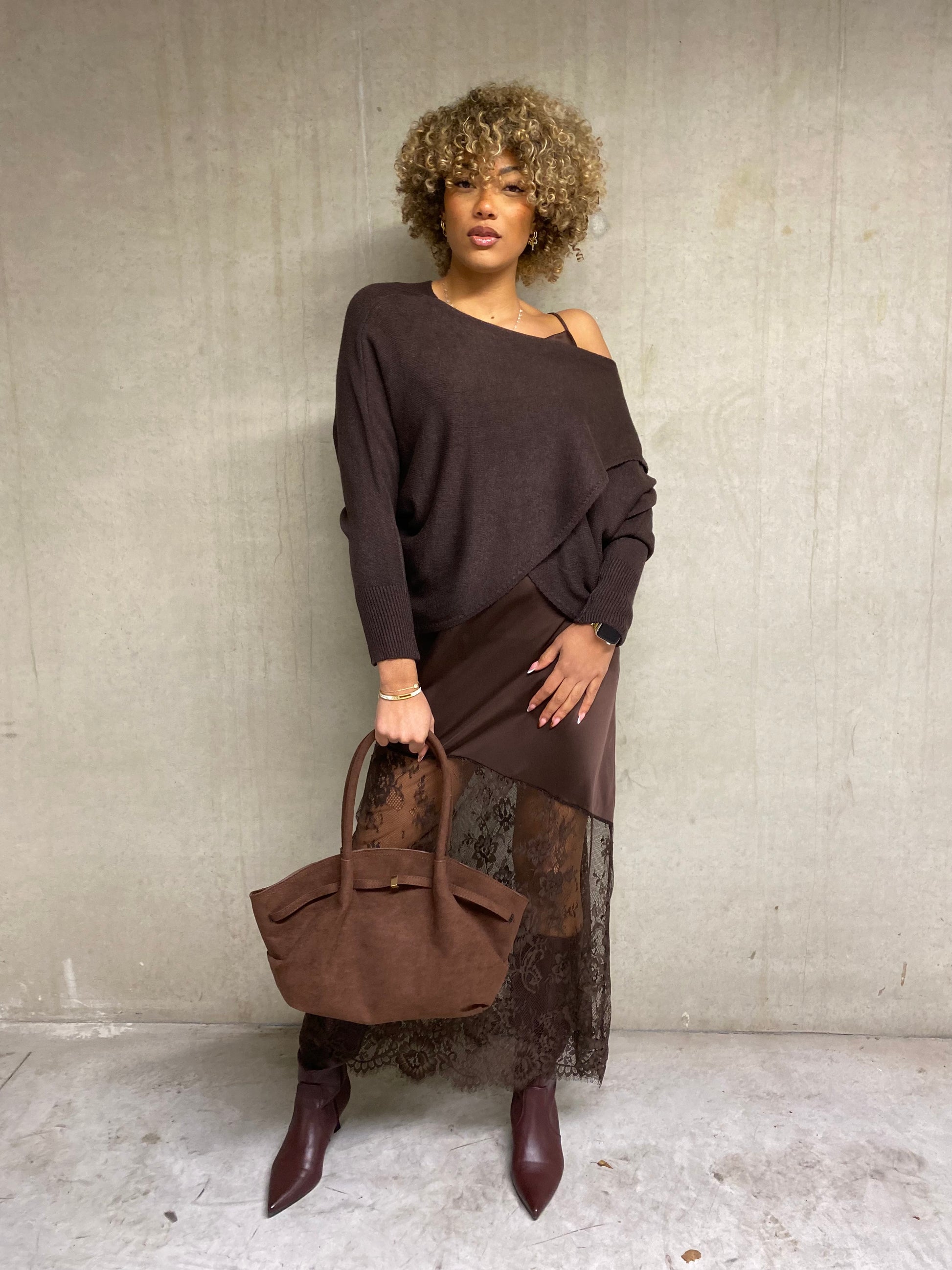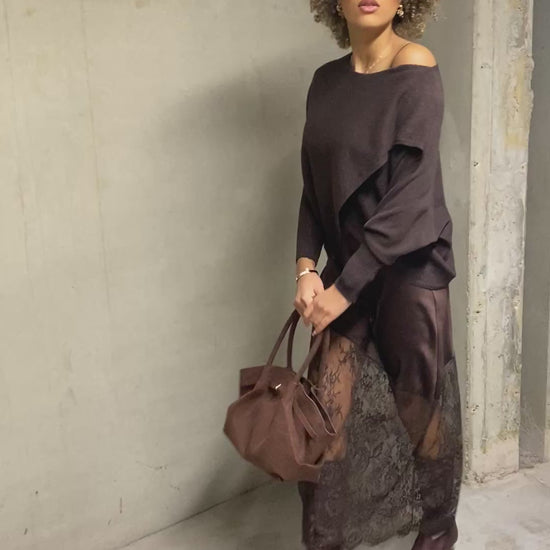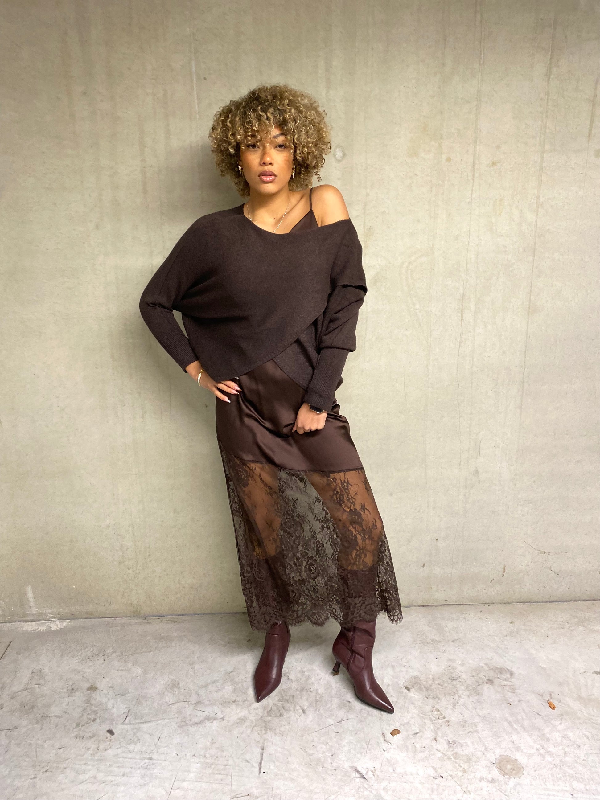 Magnifique robe en satin brun chocolat, dotée de fines bretelles ajustables et d’un col bénitier raffiné. Son bas en dentelle coupée en biais apporte une touche d’originalité et de légèreté. Matière satin, taille unique — une pièce ultra-féminine et irrésistible