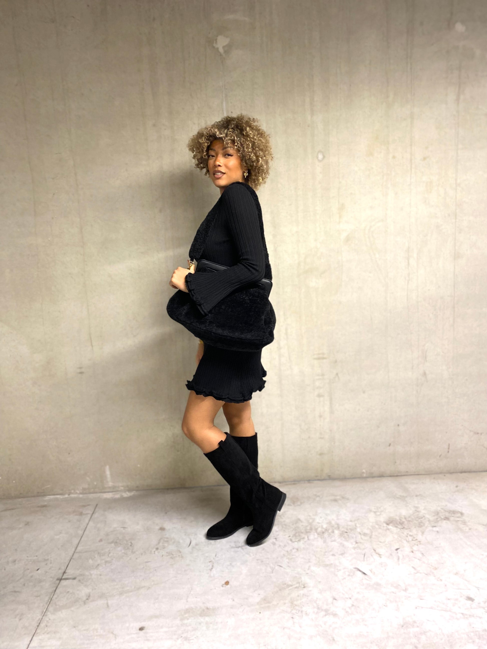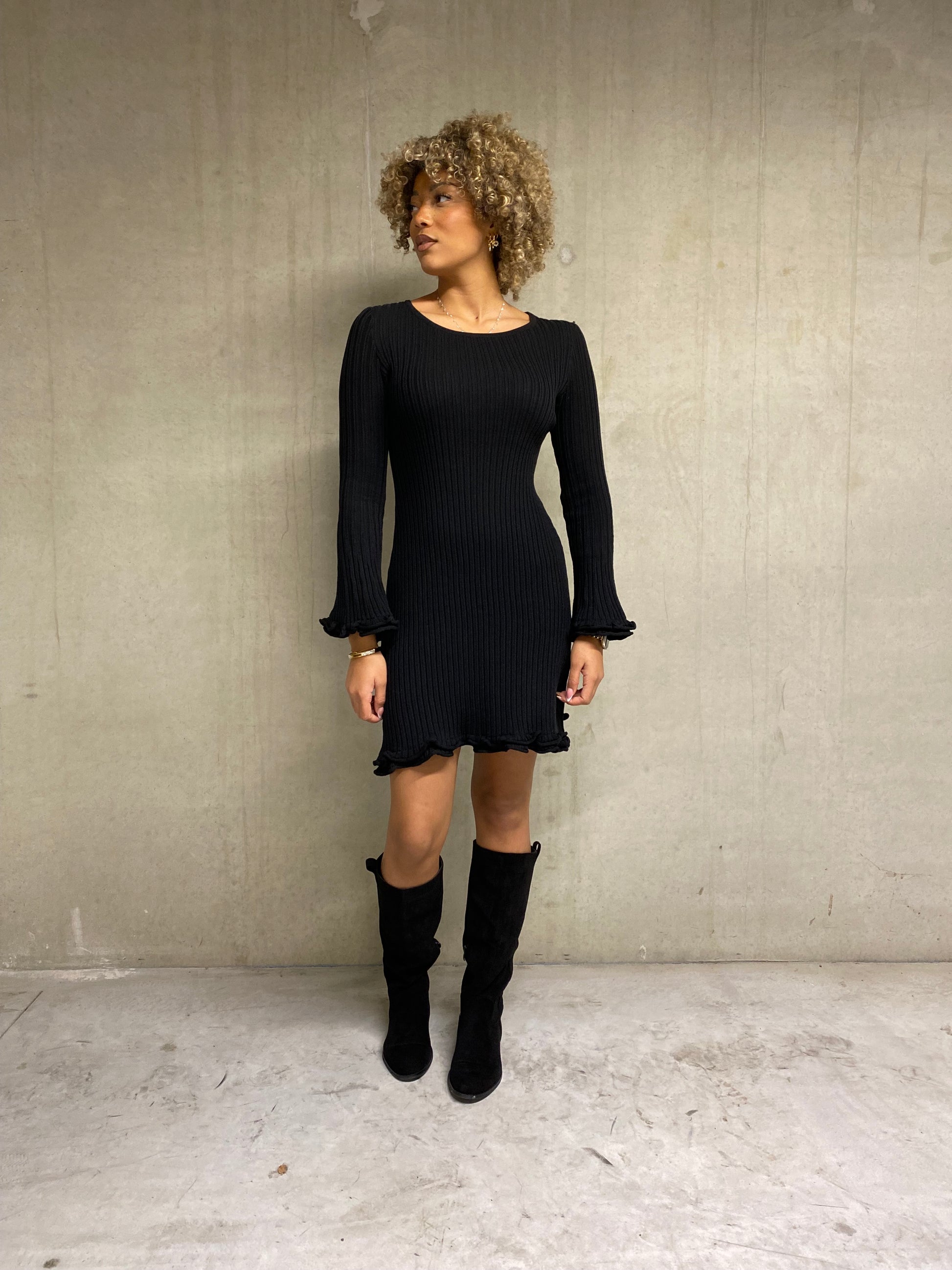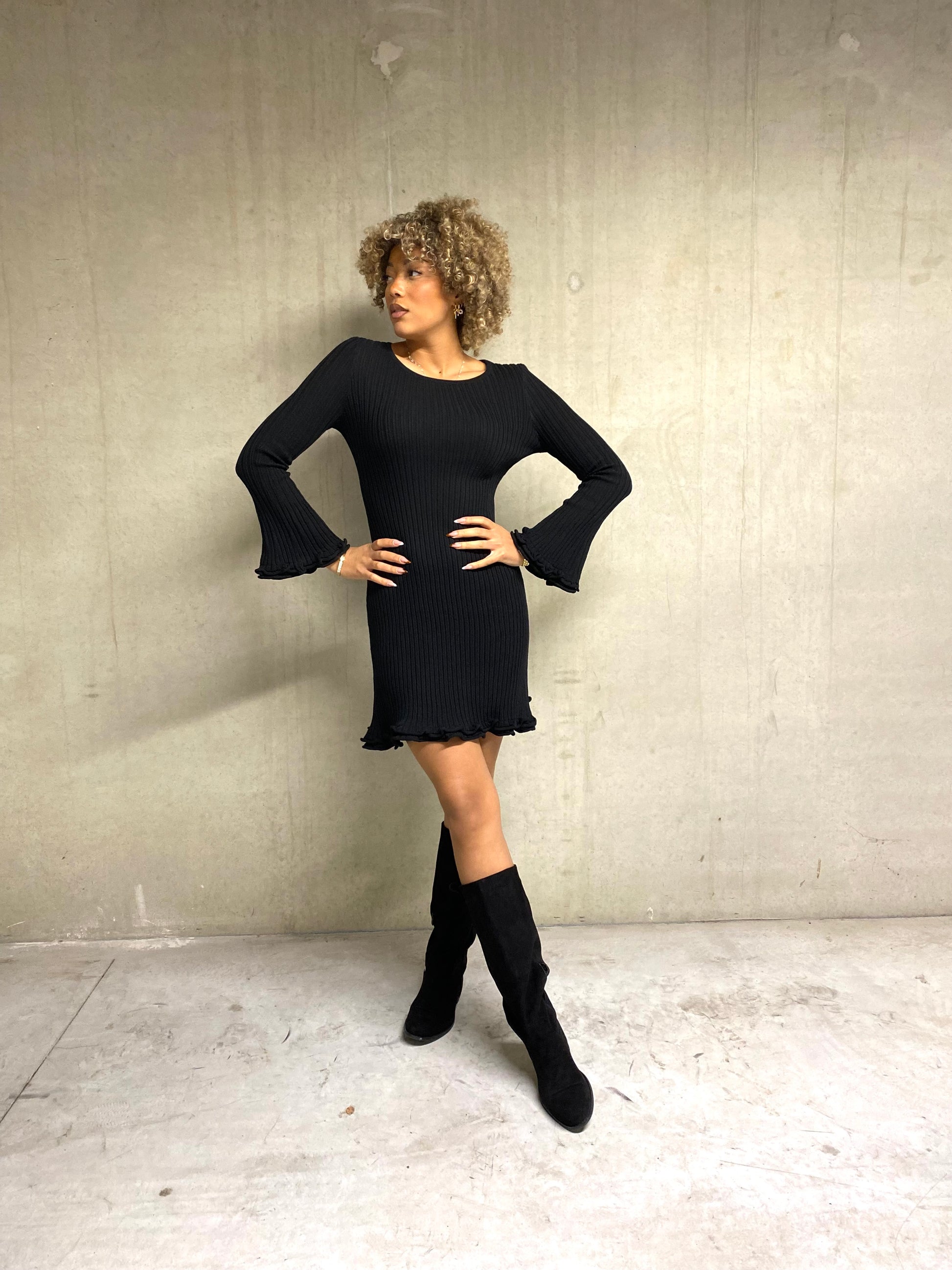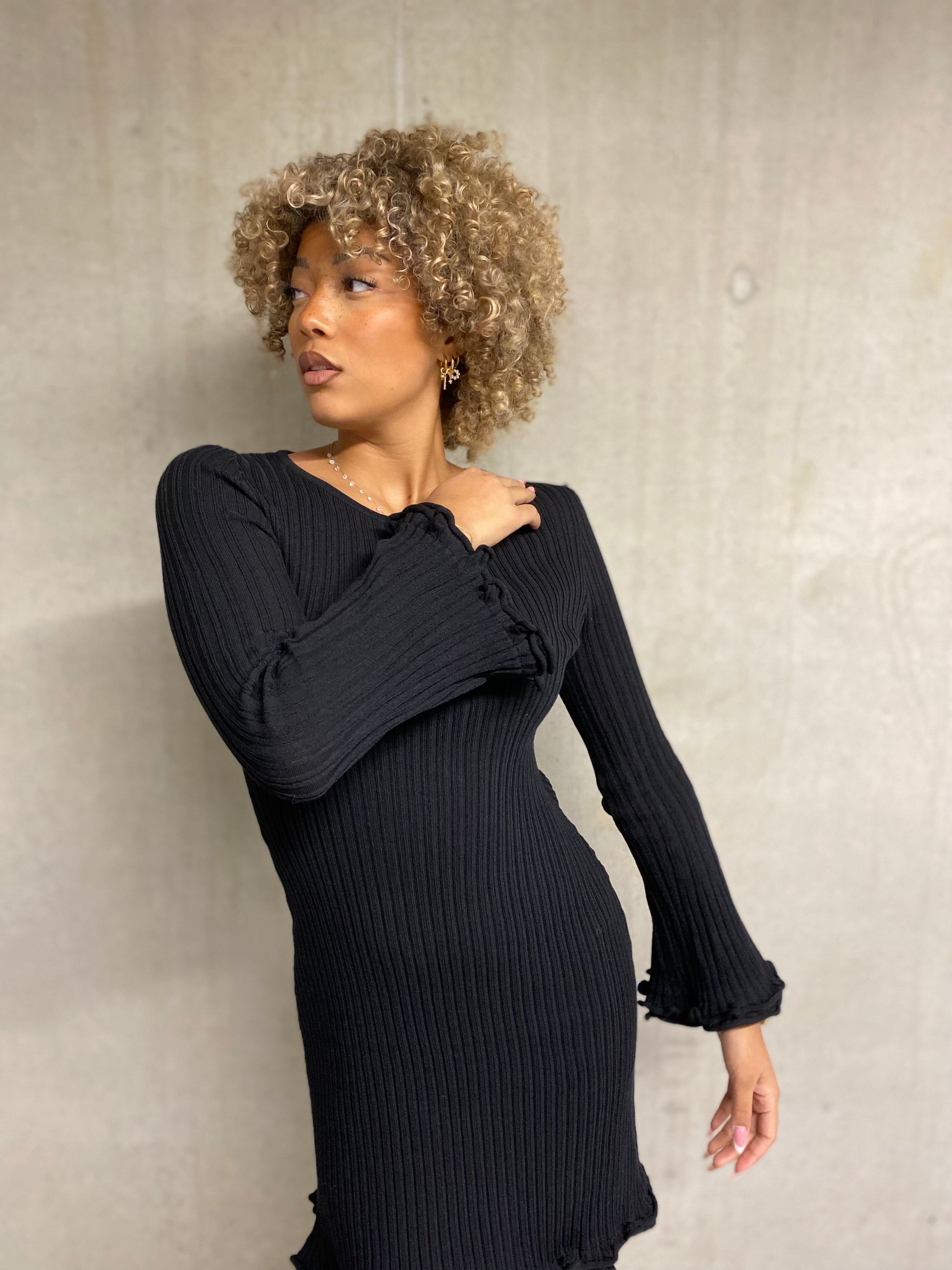 Robe manches longues, en lainage, côtelé, matière bien extensible avec un petit volant dans le bas de la robe, ainsi que au niveau des poignées qui s'écrase légèrement