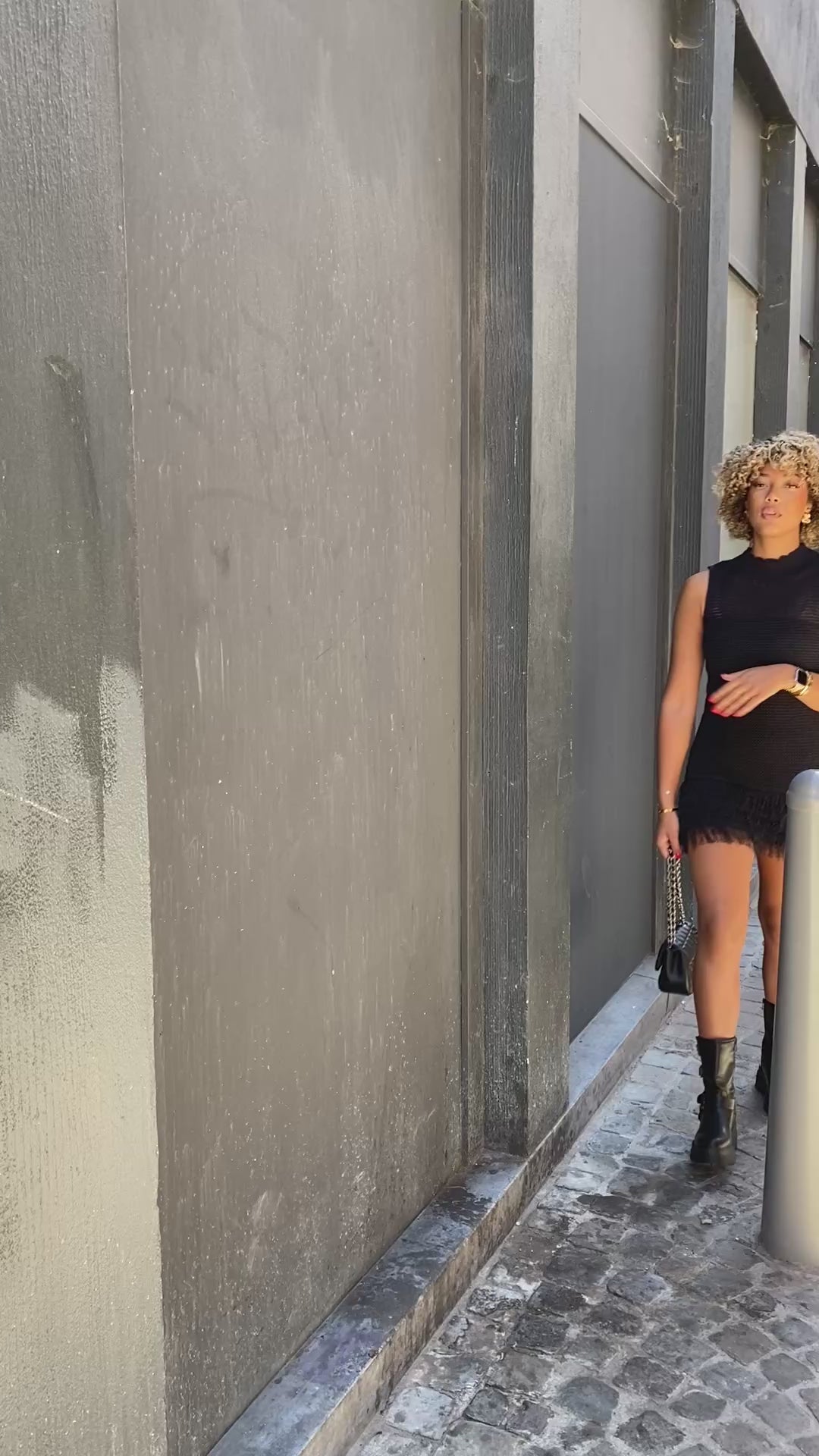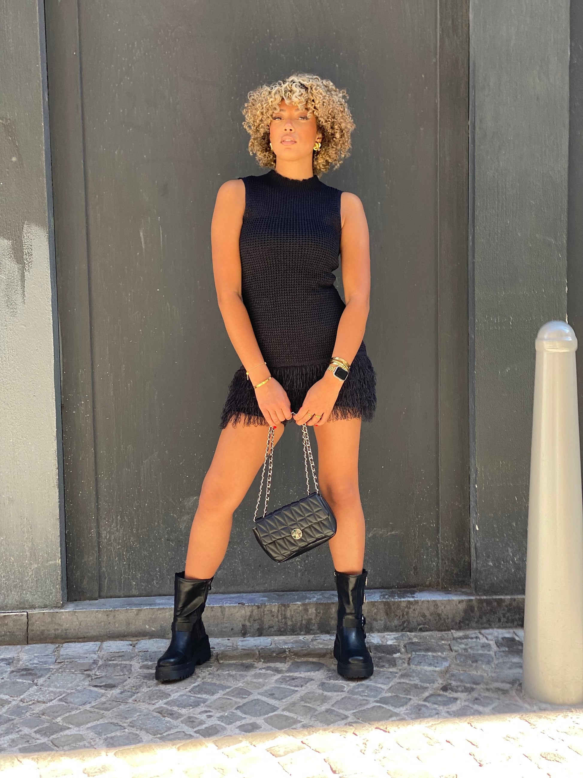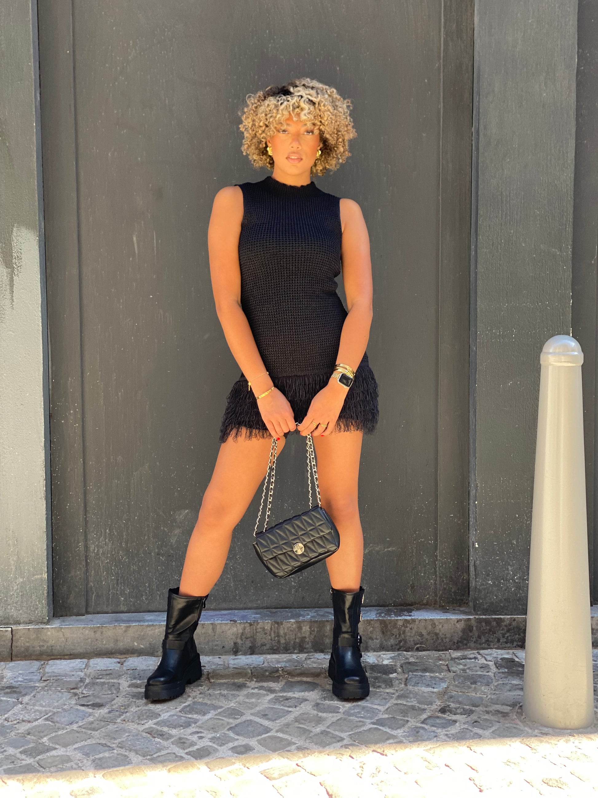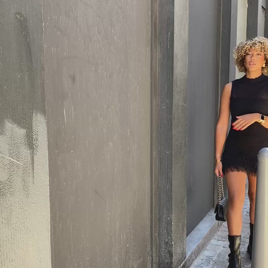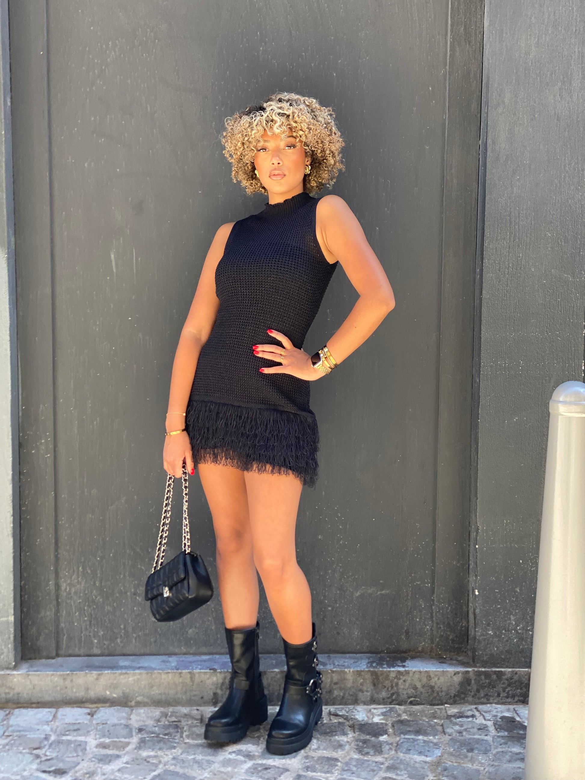 Robe courte col montant sans manches près du corps, avec le bord en froufrou de lainage