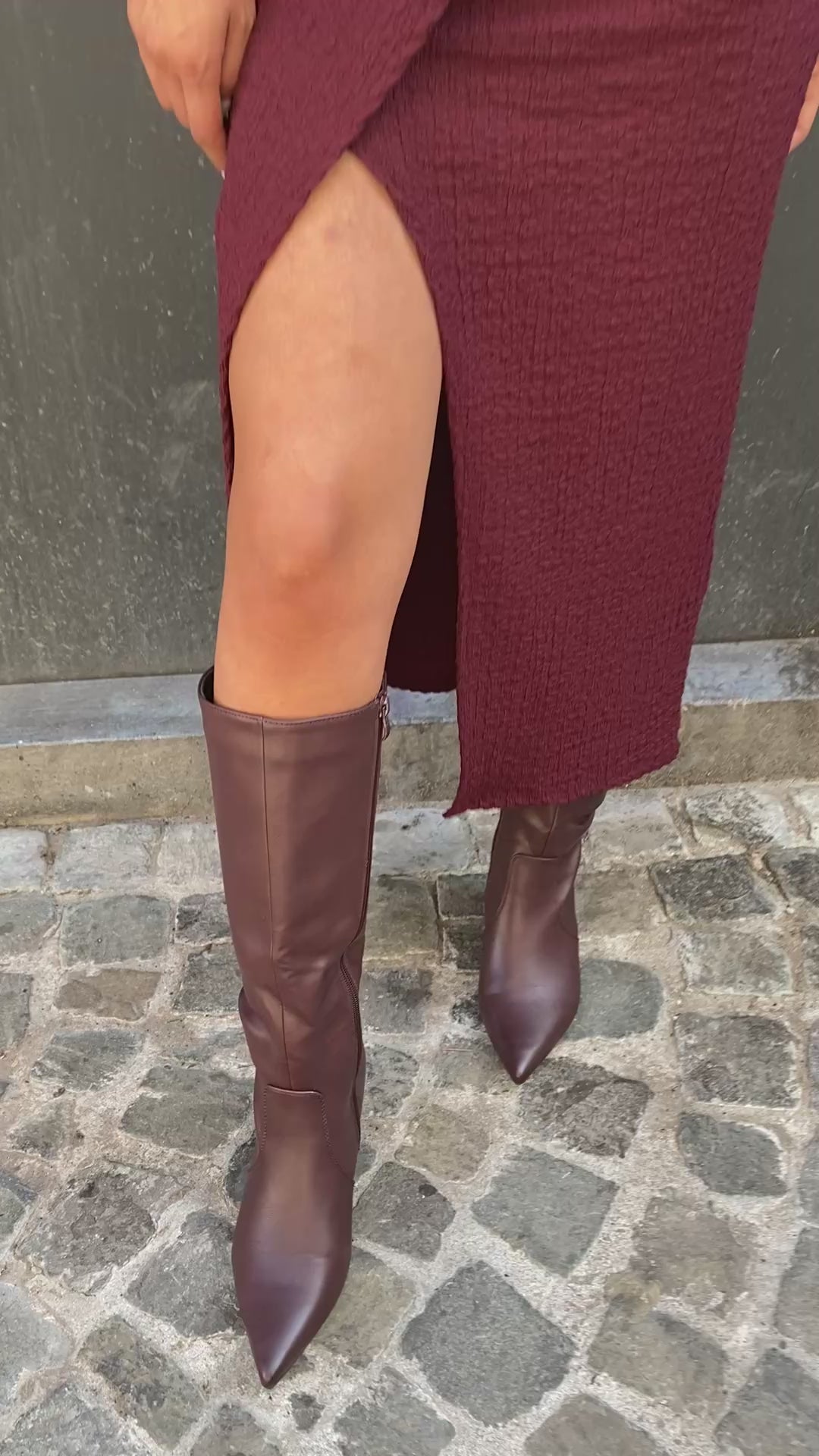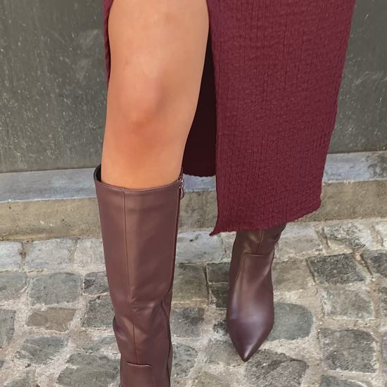 Robe manches longues, portefeuille, couleur bordeaux, repris par un drapé au niveau de la taille et un joli bijou doré