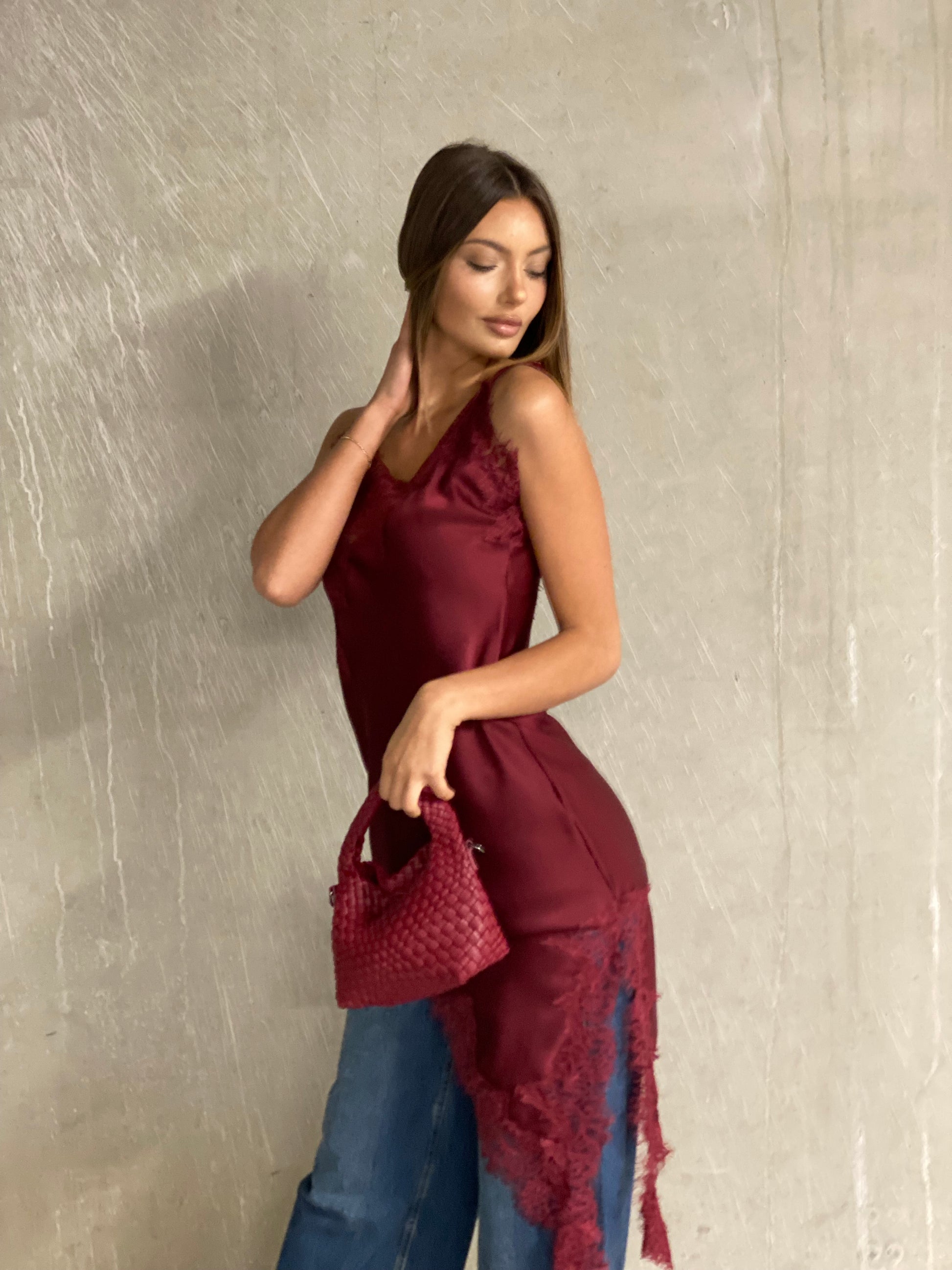 Jolie robe en satin de qualité supérieure, avec une jolie dentelle au niveau de la poitrine et dans le dos ainsi que dans le bas de la robe, elle est asymétrique avec une fente