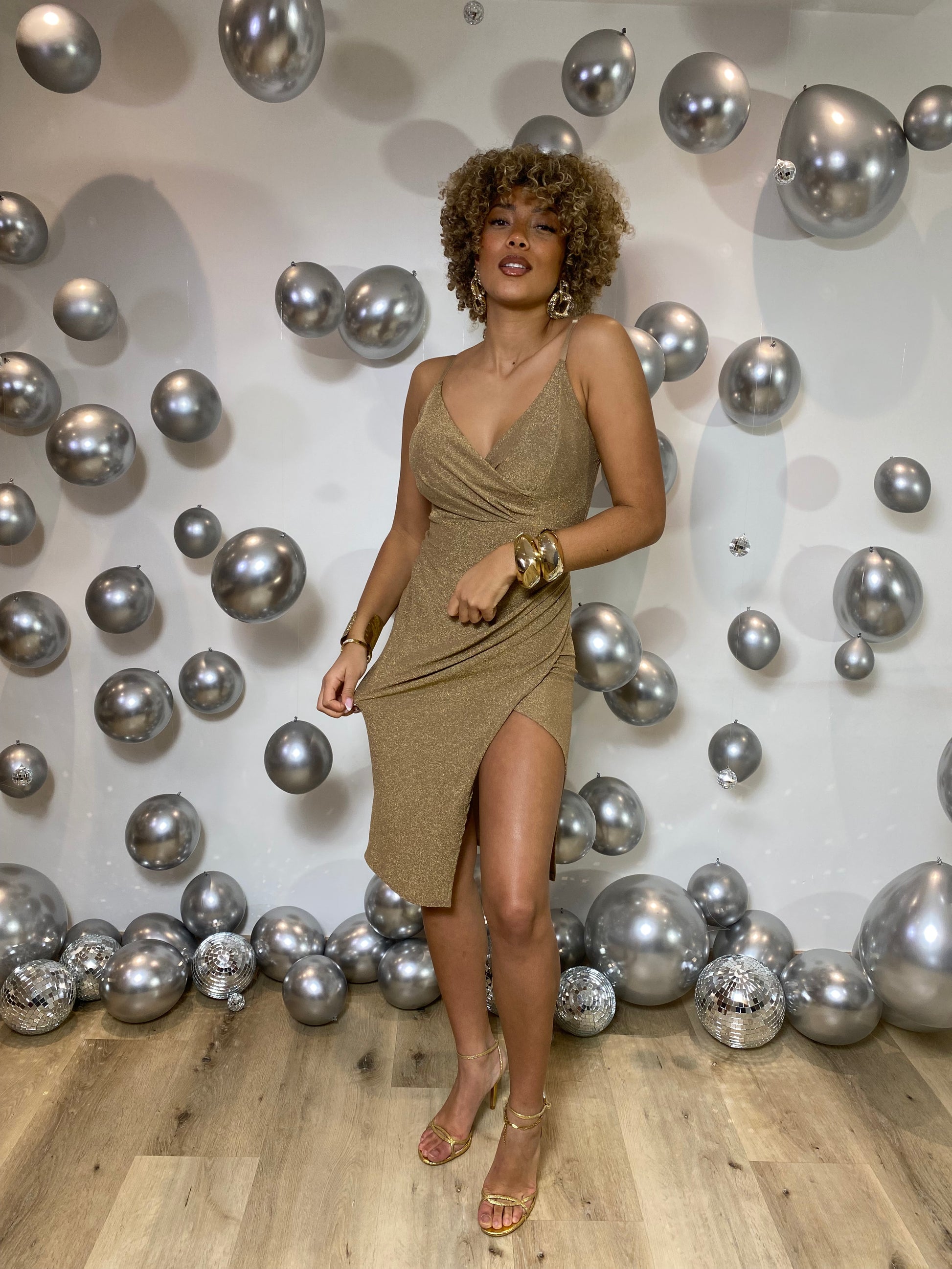 Une élégante robe en matière scintillante dorée, lumineuse et fluide, parfaite pour attirer tous les regards. Elle présente un drapé raffiné sur le côté au niveau de la taille, qui met en valeur la silhouette avec subtilité.