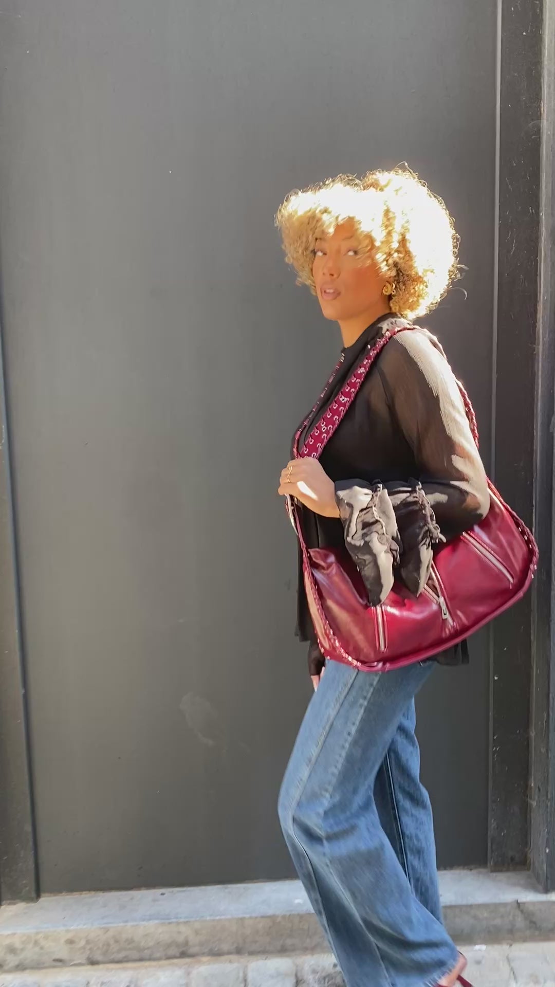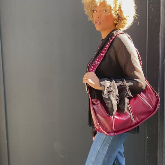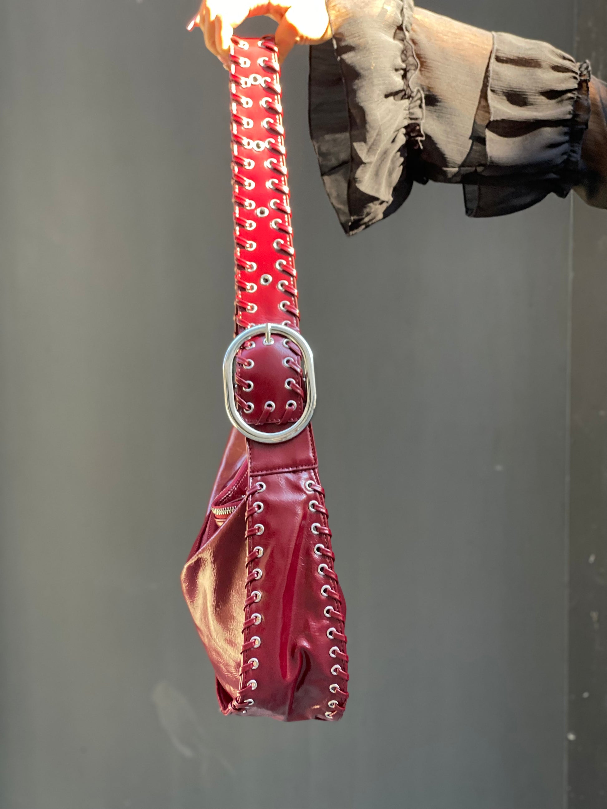 Grand sac bordeaux vernis avec une lanière clouté et des tirette