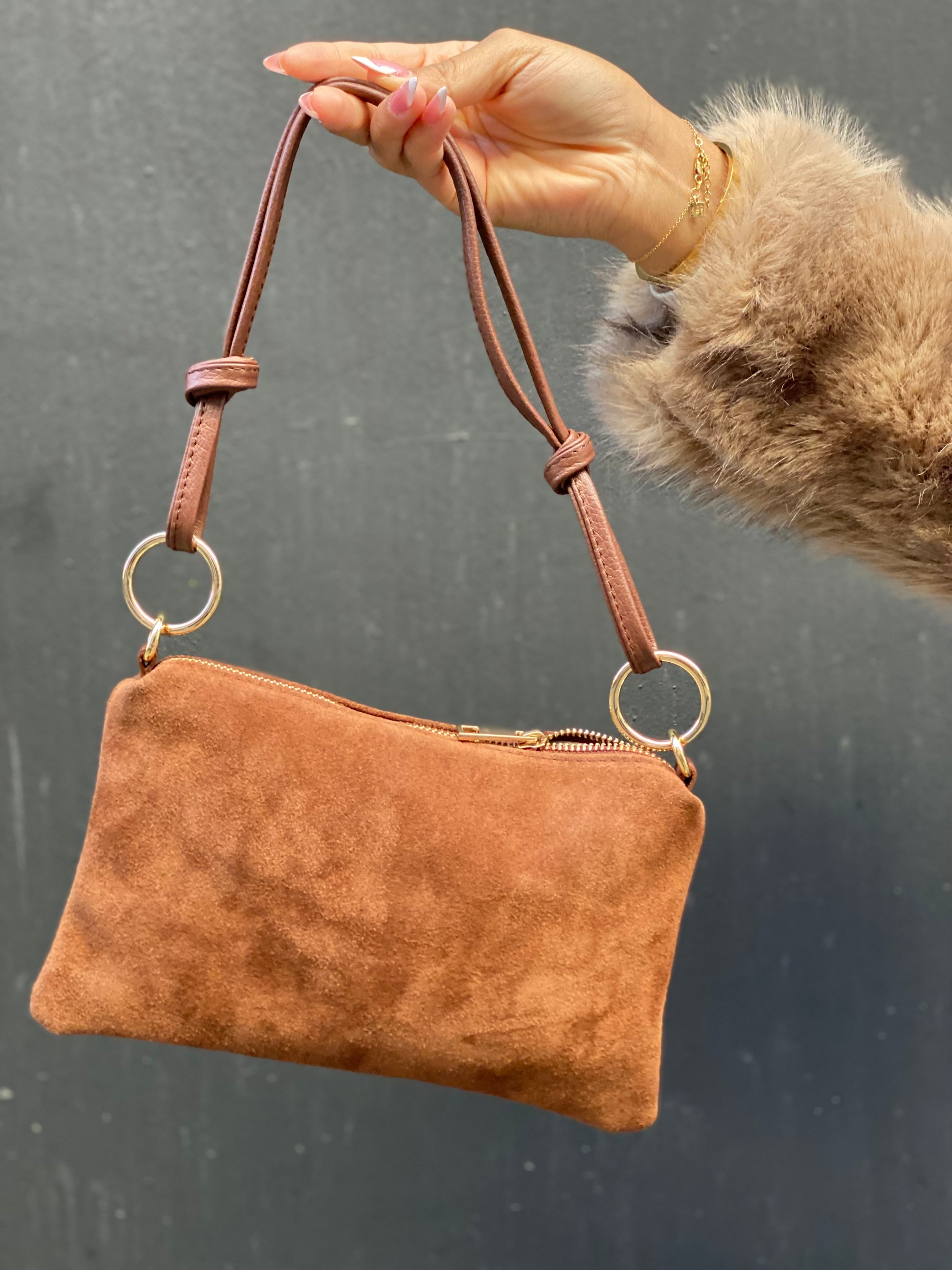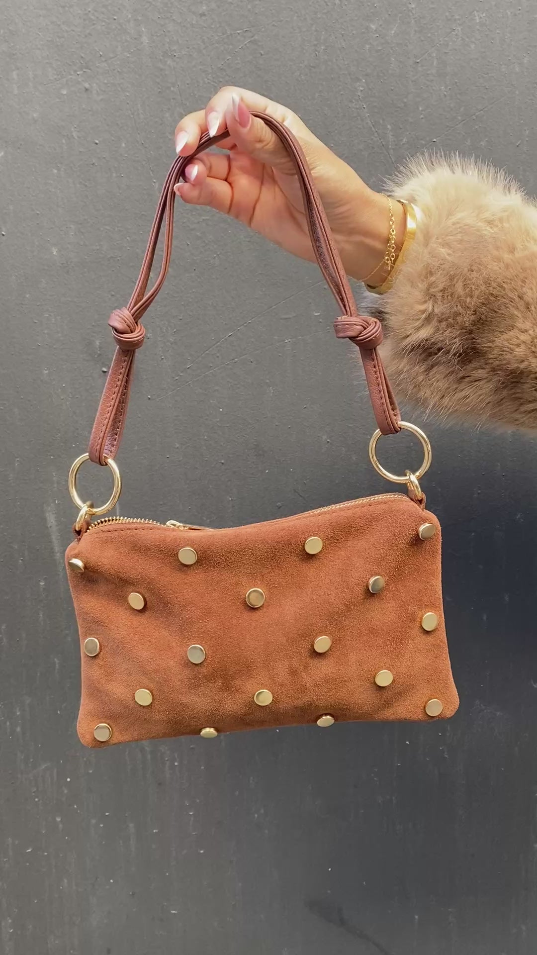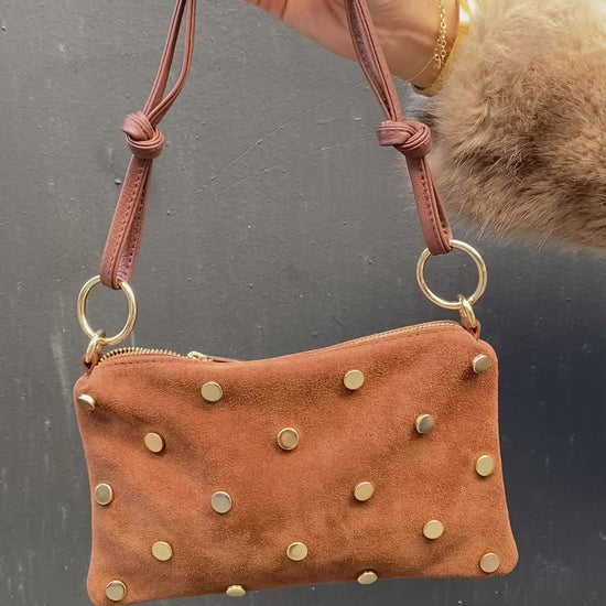 Petit sac, pochette en cuillère véritable daim, couleur Camel avec des petits clous doré, des anneaux de doré, une petite lanière en cuir et vous avez également une grande lanière pour le porter en bandoulière à l'intérieur du sac
