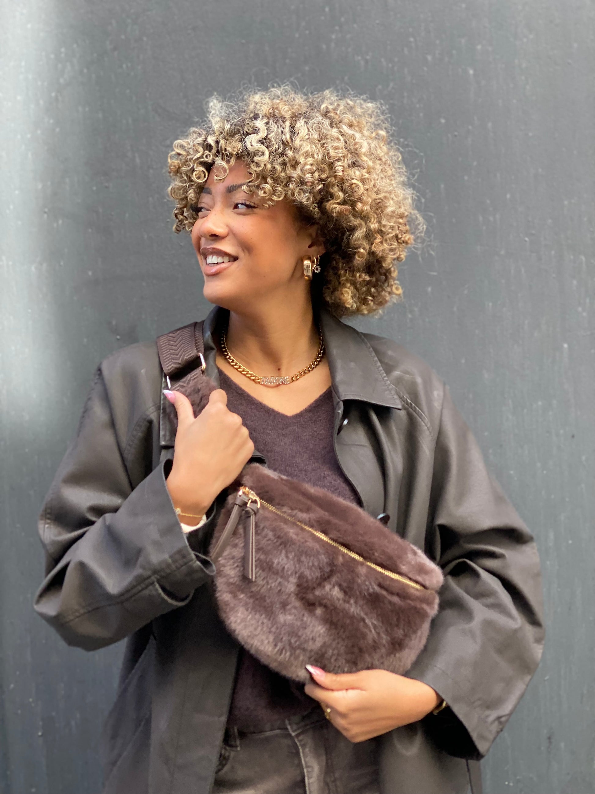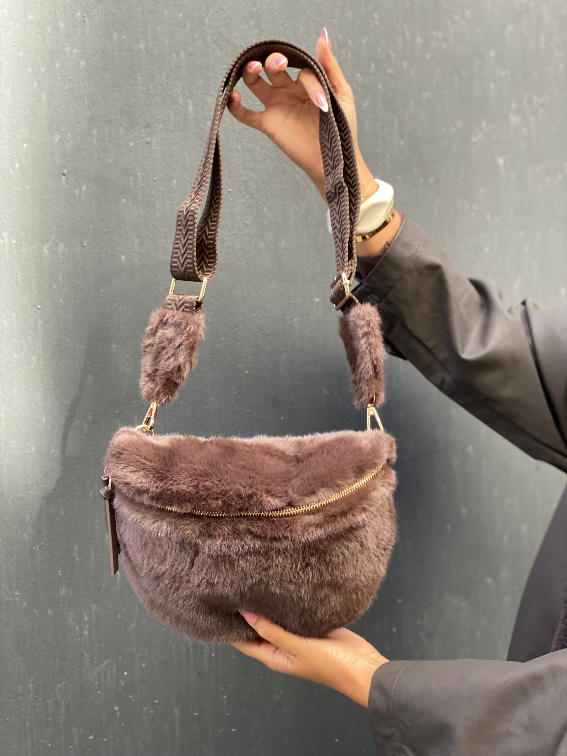 Sac en fausse fourrure, couleur chocolat foncé, avec une tirette dorée et une lanière brune et fourrure aussi