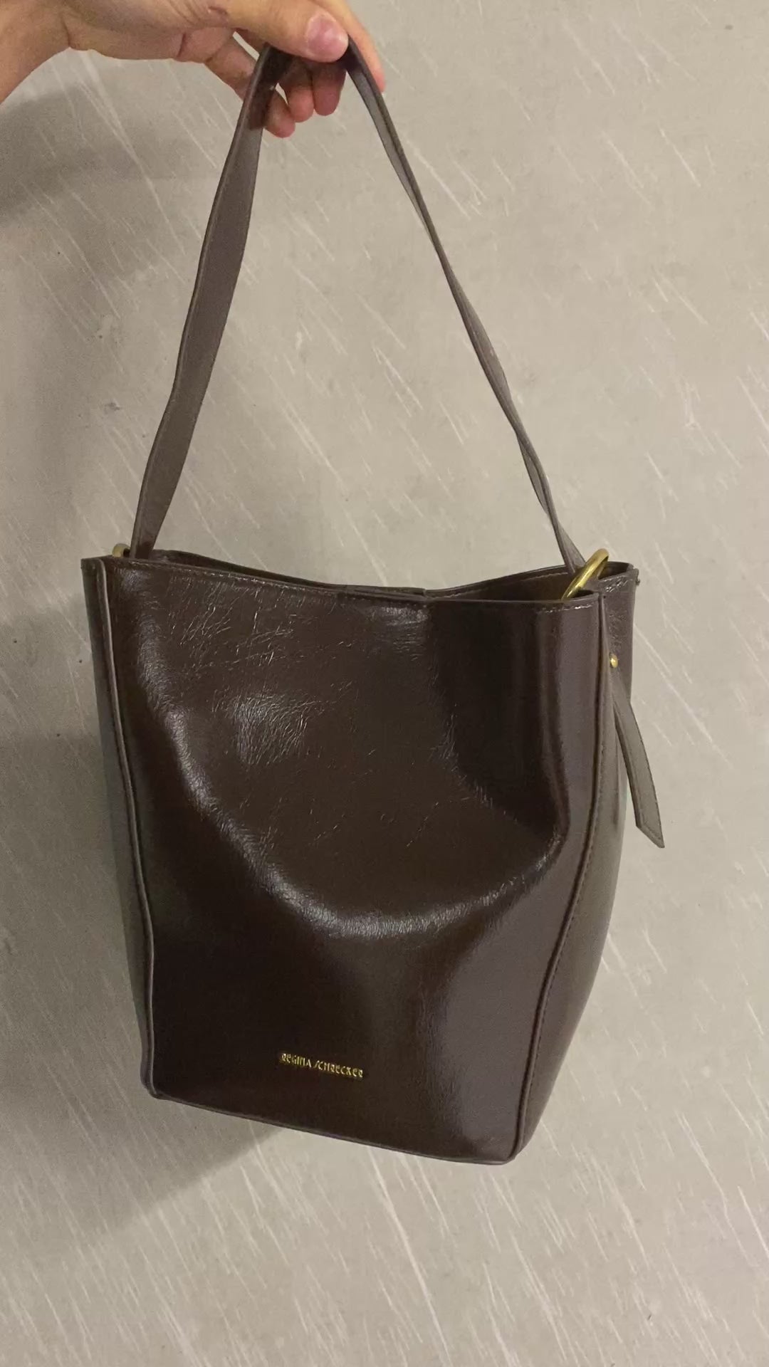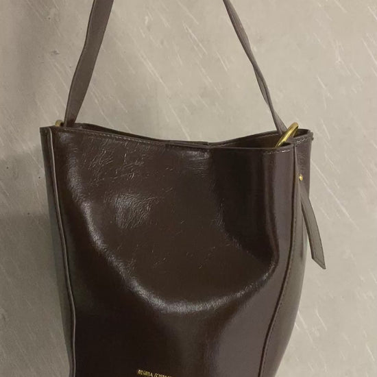 sac en vinyle, un peu vernis brun, avec un sous ton bordeaux, une pression et un deuxième petit sac à l'intérieur pochette bandoulière. Petite forme très tendance