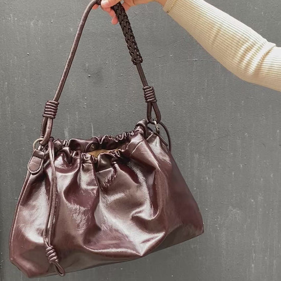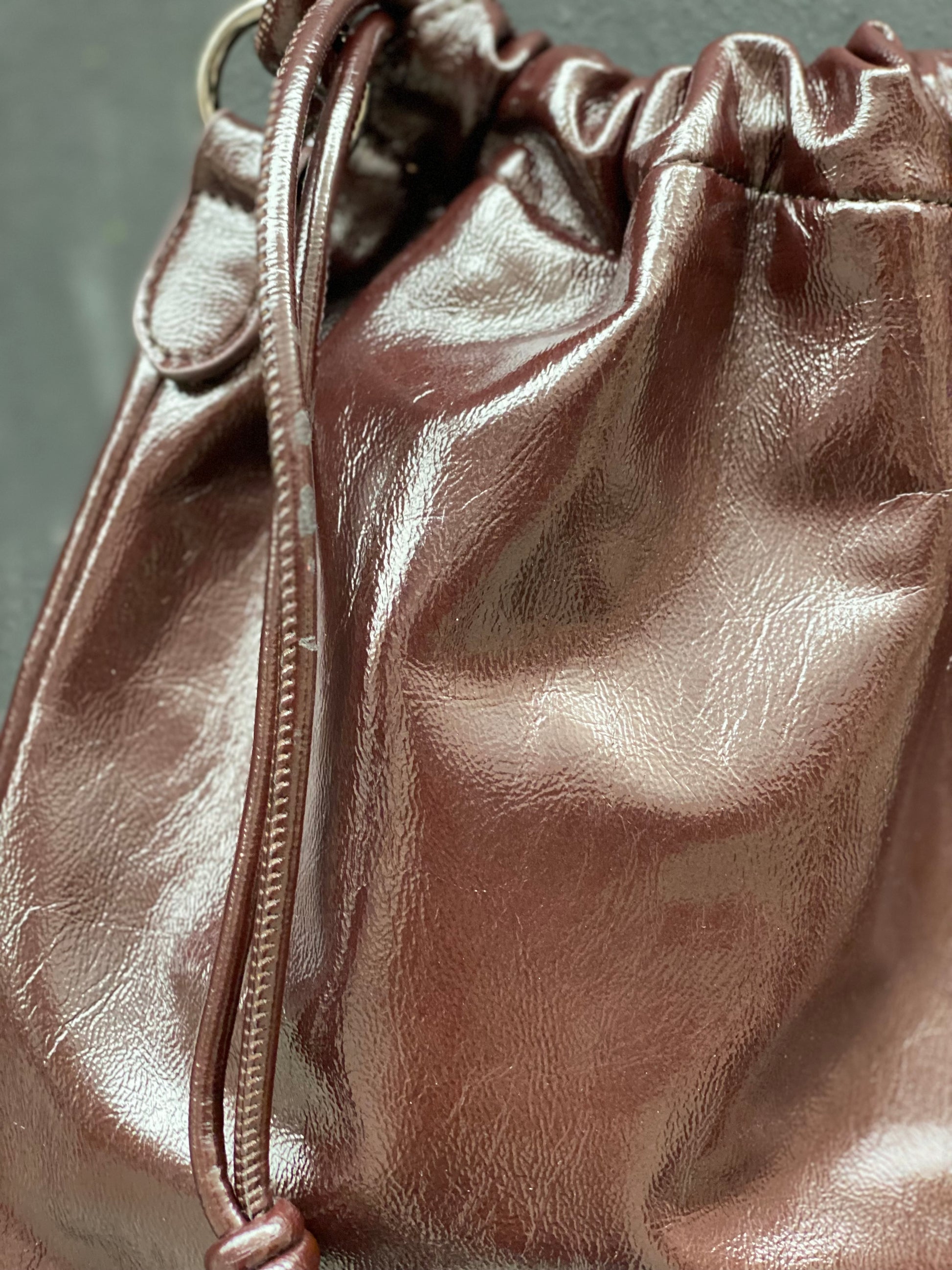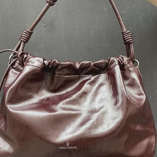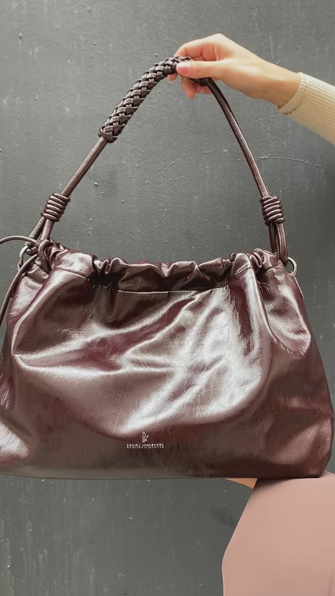 Grand sac, en matière vernis, brun, très foncé, avec des petits reflets aubergine de la marque Régina