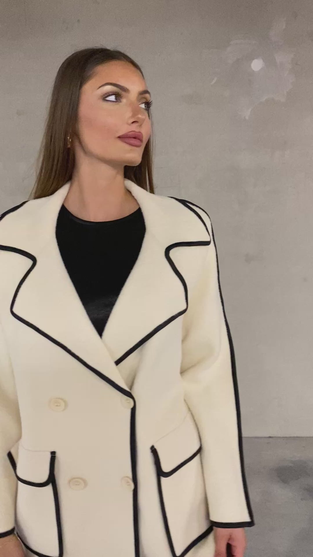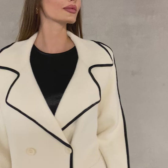 Gilet épais, qui peut se porter en petite veste de demi-saison, en matière feutrine beige avec des surpiqûres noir et un bord noir au niveau du col des poches et des manches, la coupe est large over size