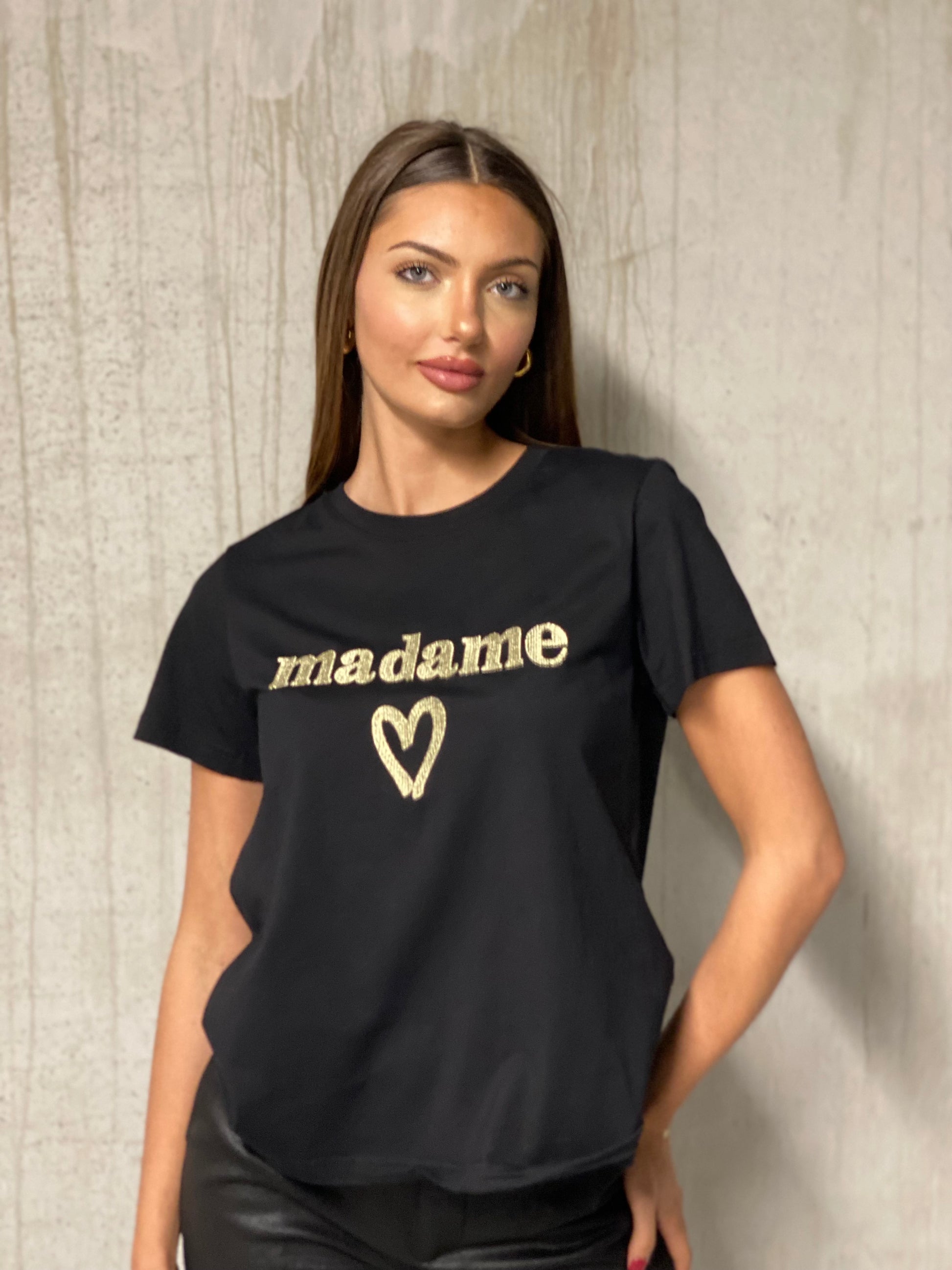 T-shirt manches courtes, colle rond, coupe droite de qualité supérieure avec une inscription brodé en fil doré. MADAME