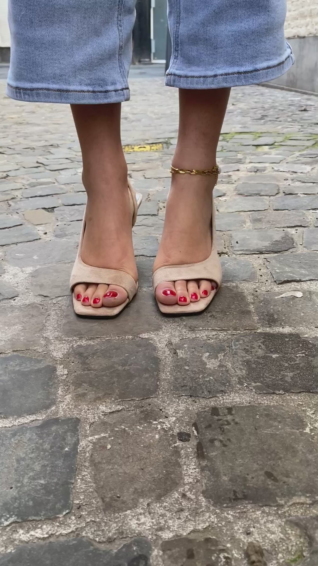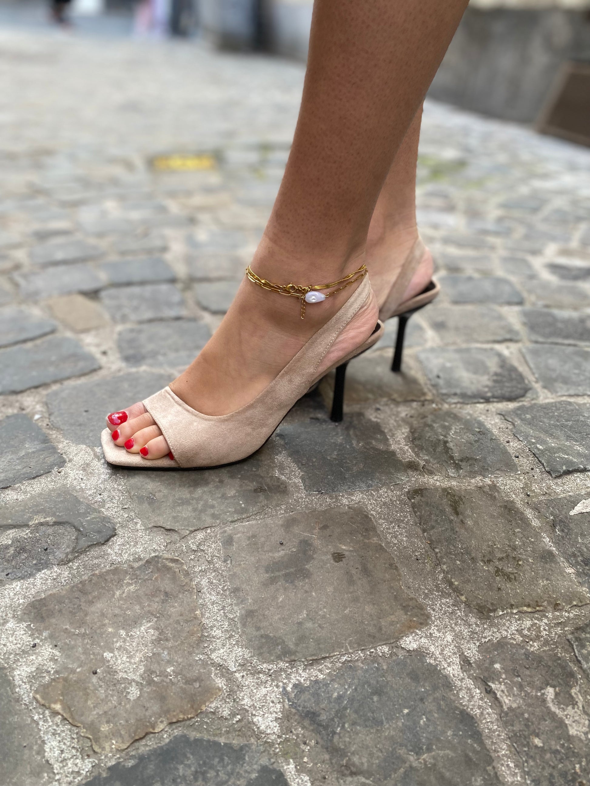 Paire de chaussures beiges en matière suédine douce et raffinée, montée sur un talon d’environ 7 cm qui élance la silhouette tout en restant confortable.