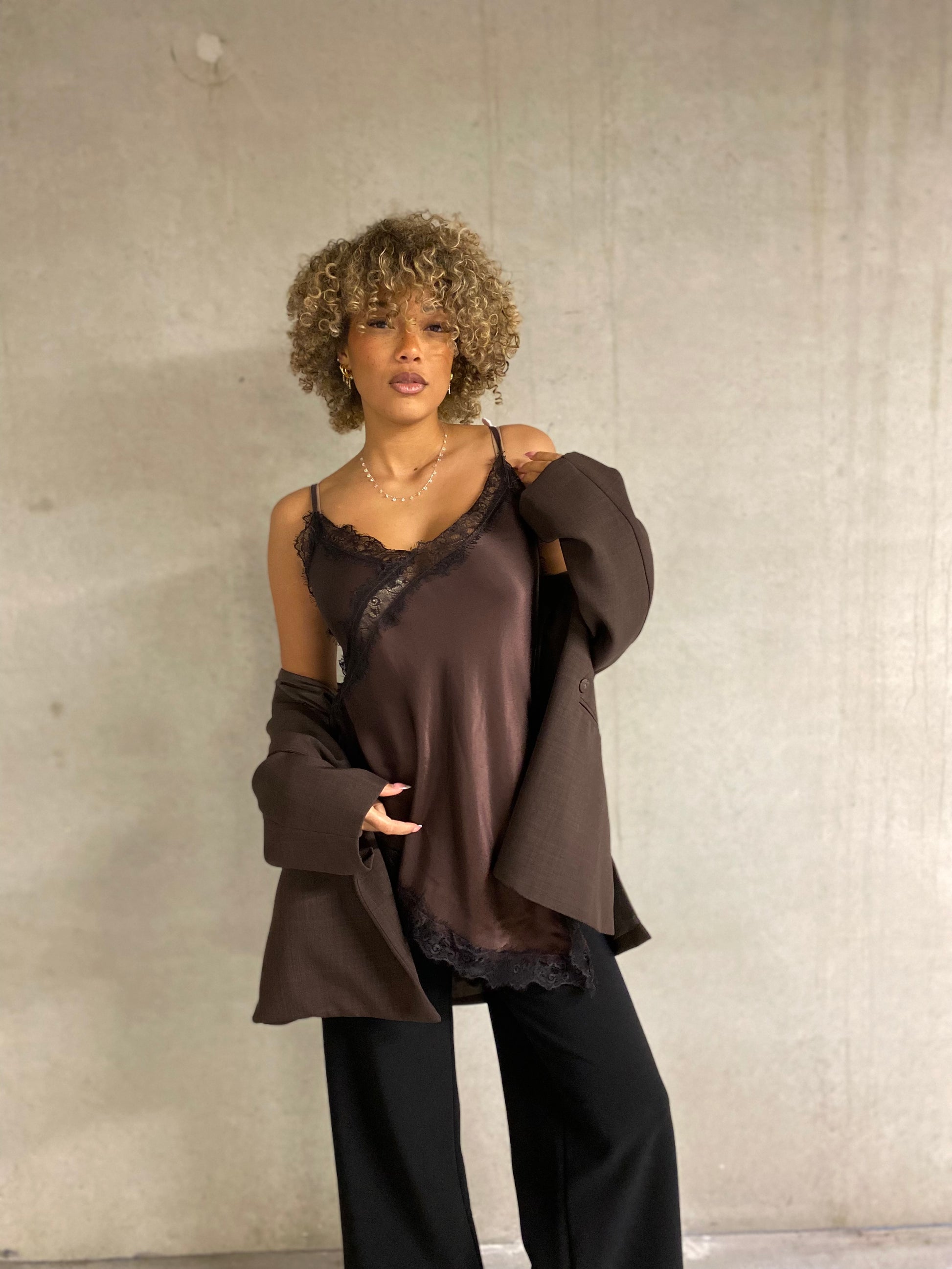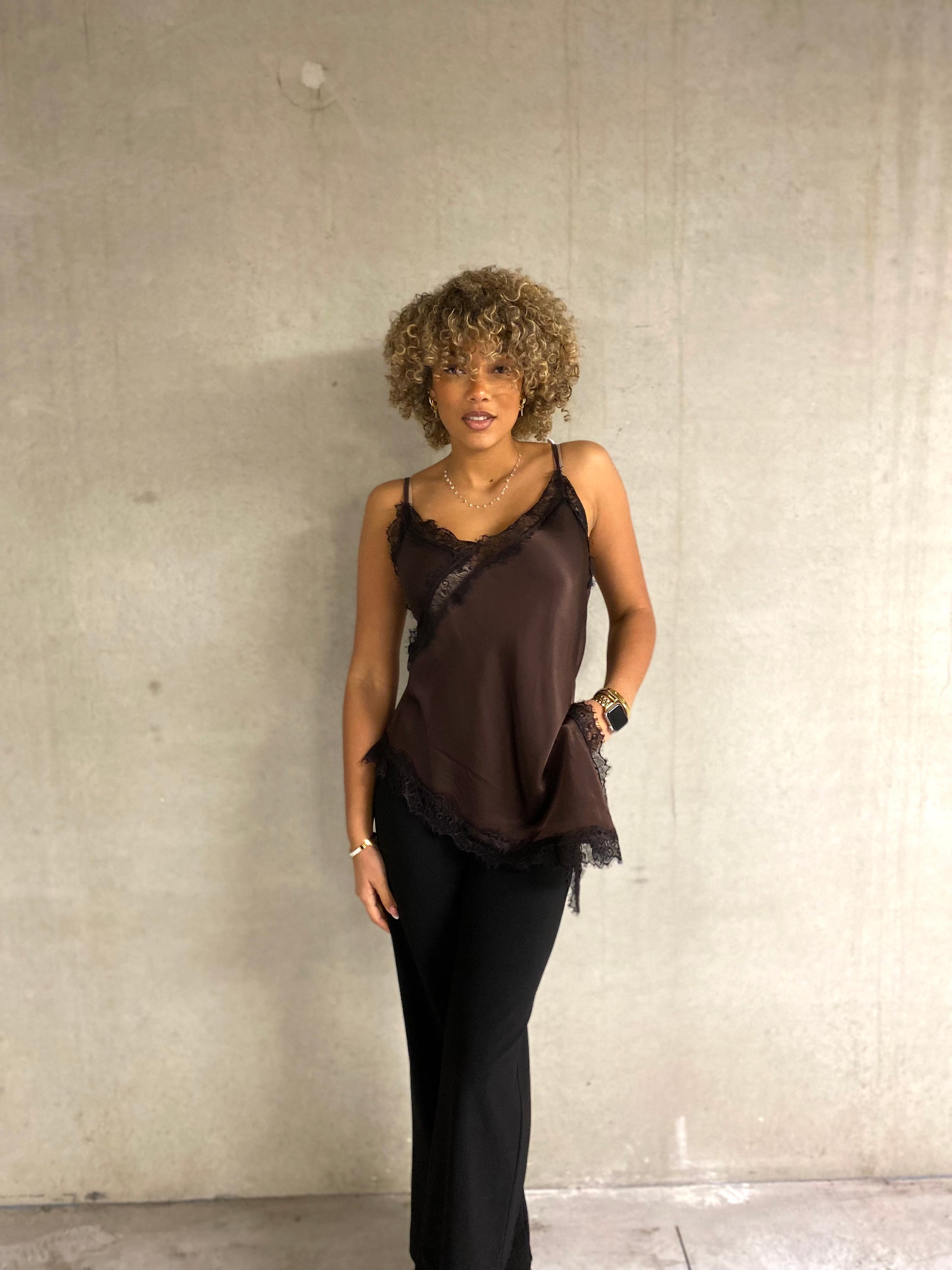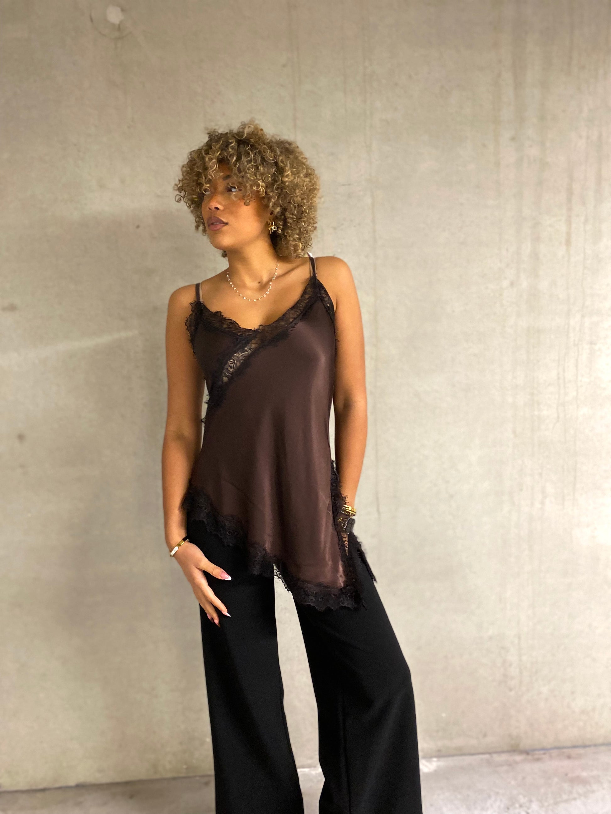 Blouse-tunique en satin, sublimée par de délicats bords en dentelle. Sa coupe asymétrique avec fente latérale en dentelle lui donne un style nuisette très actuel. Taille unique, féminine et tendance