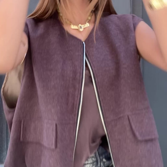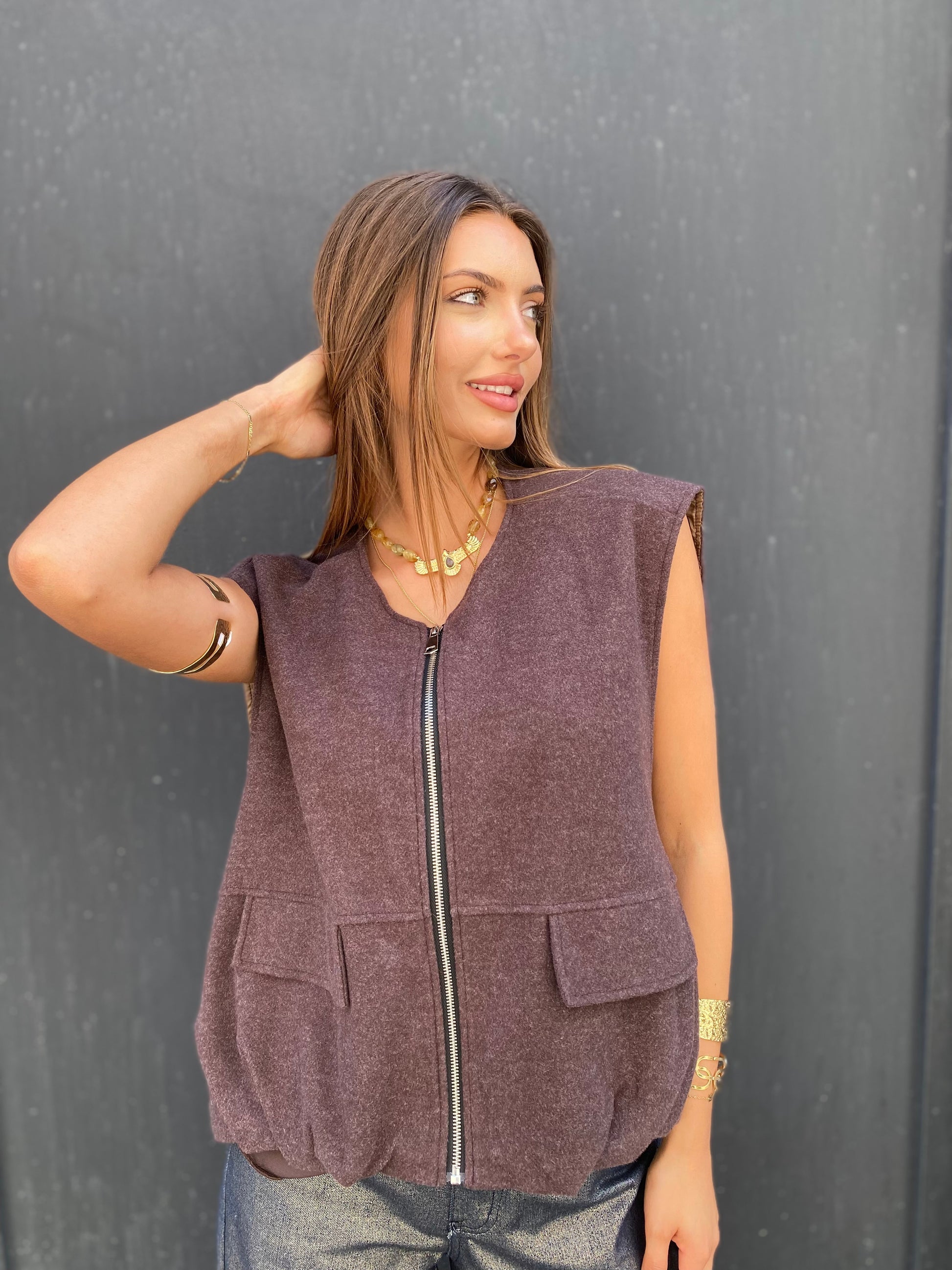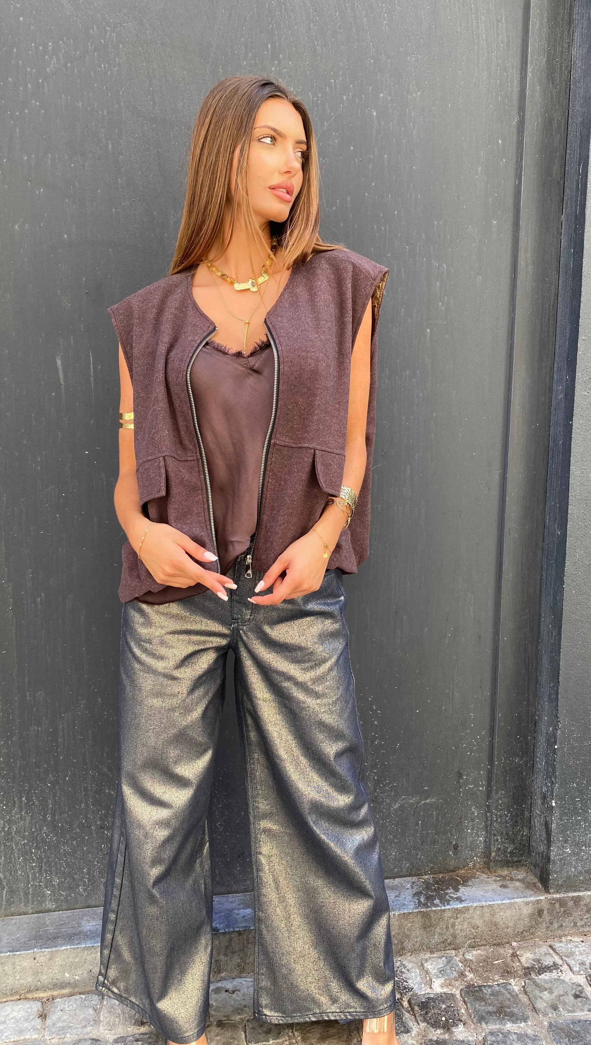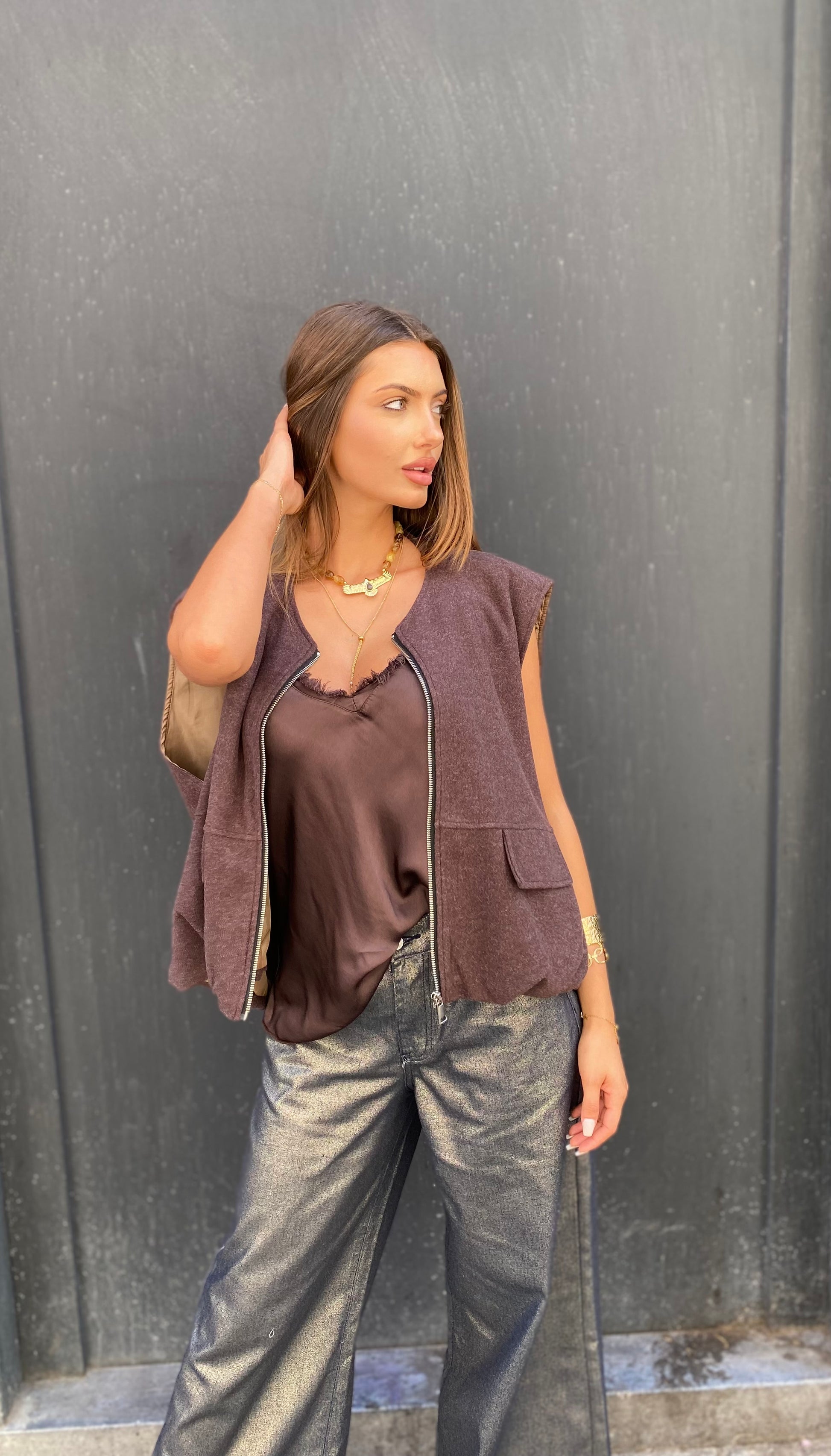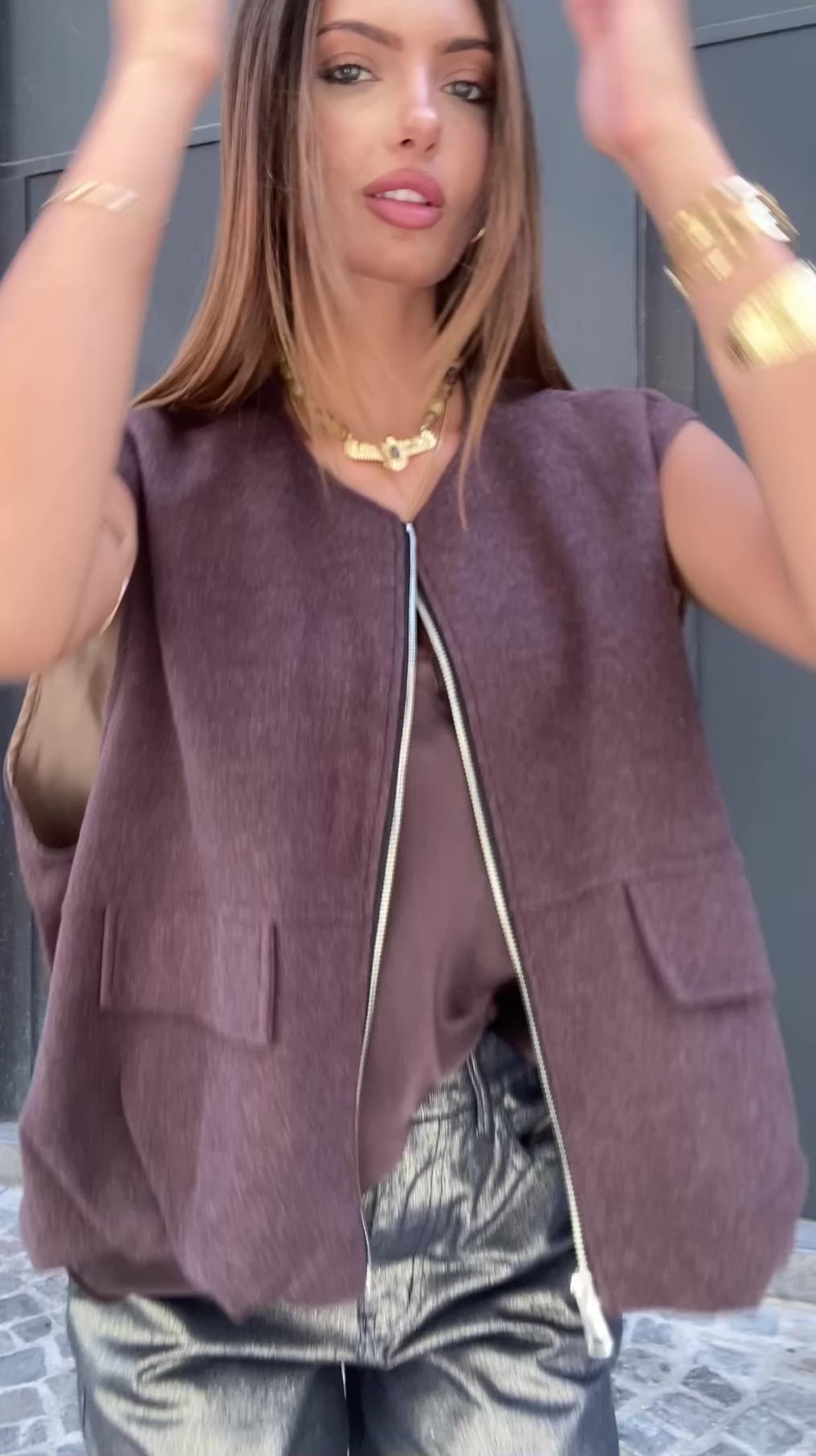 Veste over size, repris à la taille effet ballon avec une tirette et des fausses poches. Elle est doublée.