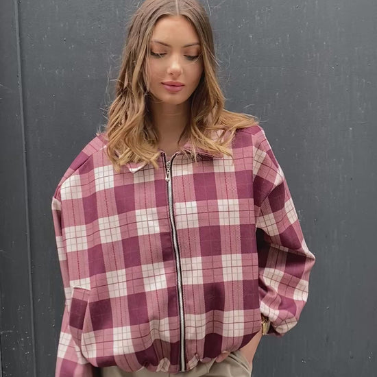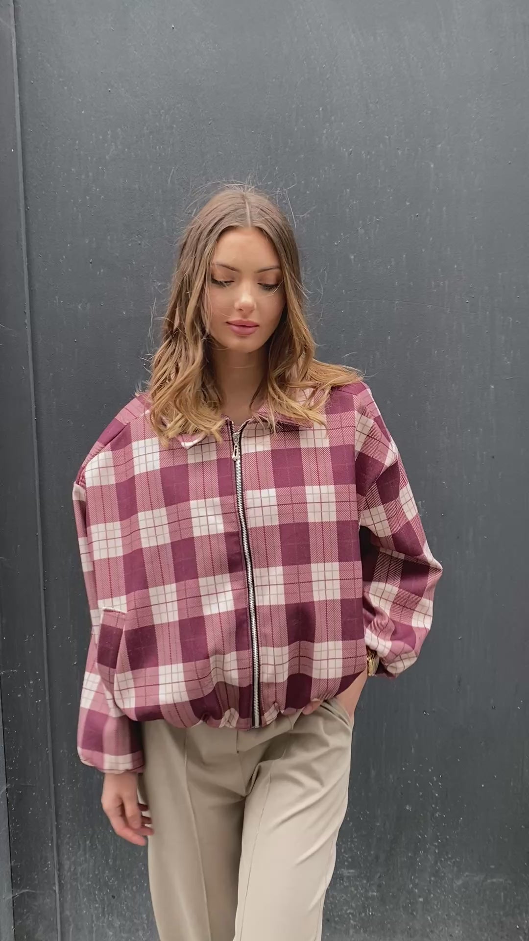 Veste Bombers avec une fermeture tirette, deux poches bordeaux à carreaux beige, elle est doublée de synthétique. La coupe est ballon, taille unique, mais over size.