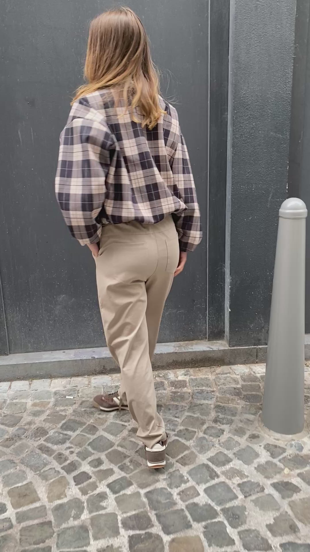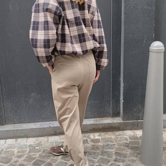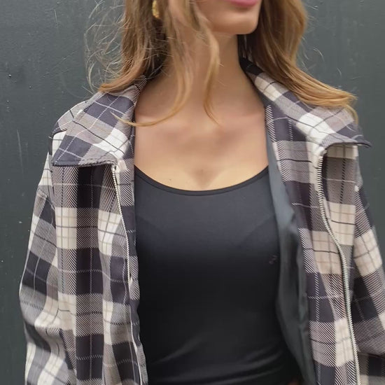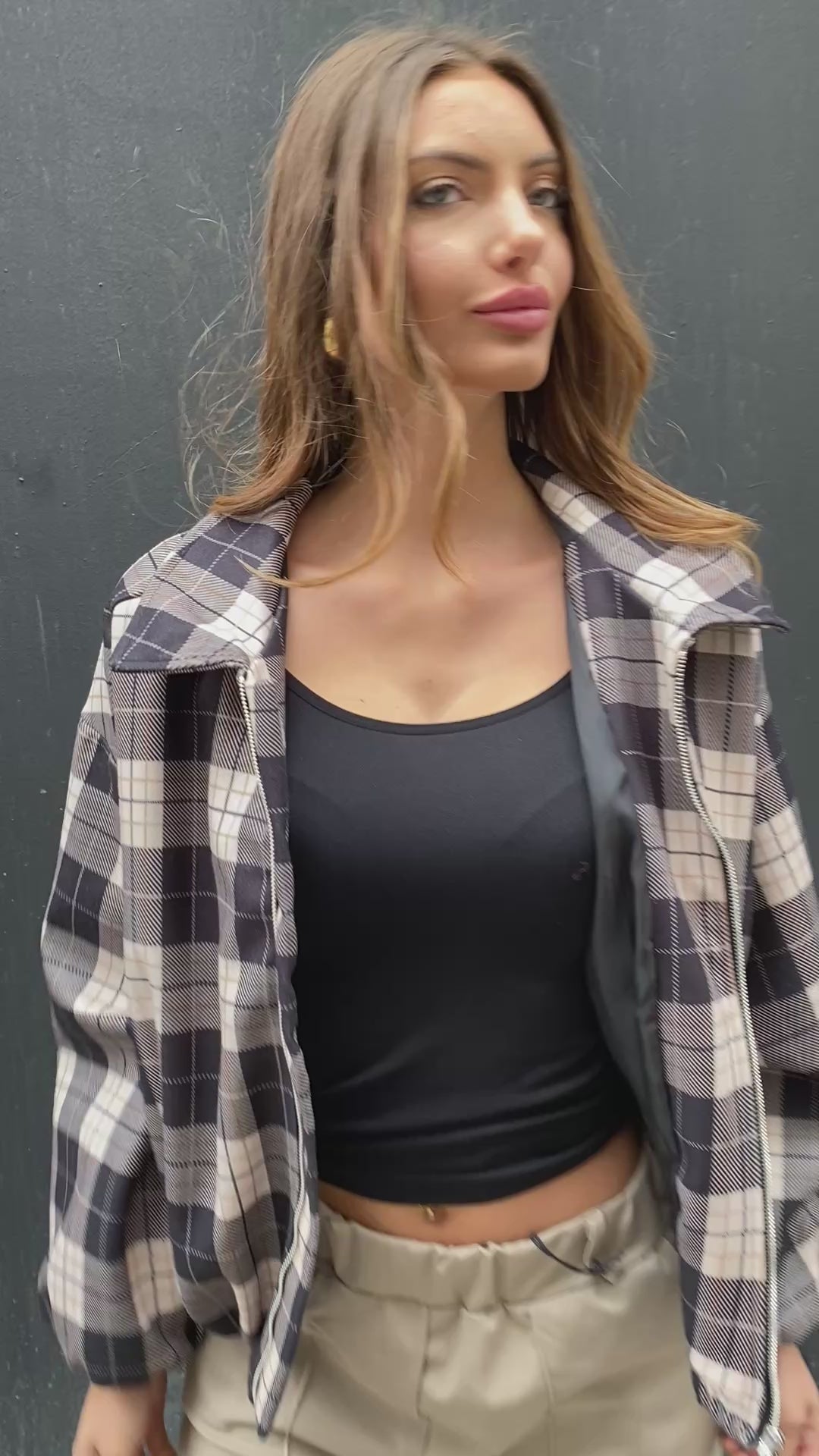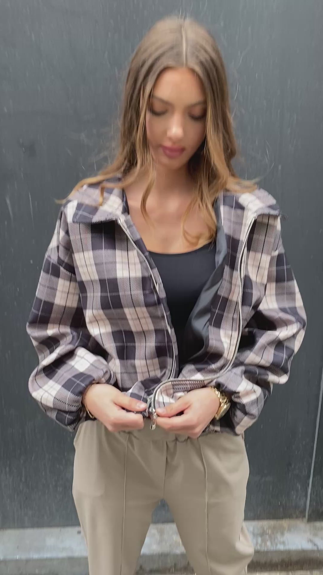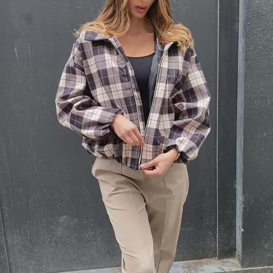 Veste Bombers, imprimé carreaux dans les tons de beige noir, coupe ballon avec deux poches, elle est doublée de synthétique