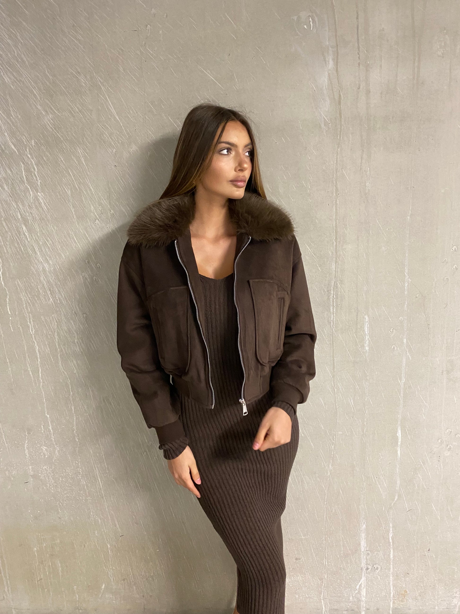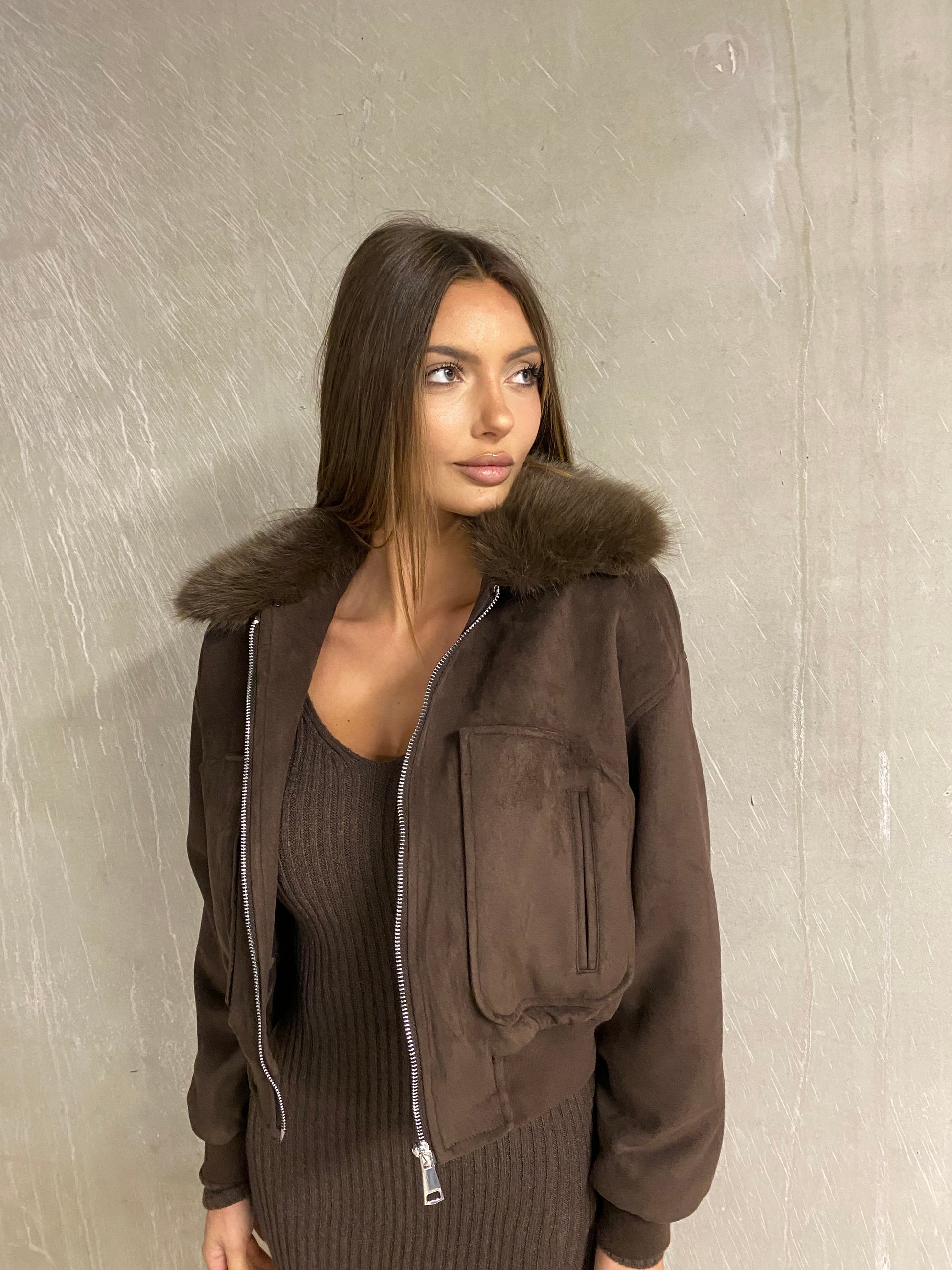 Jolie petite veste courte Style Bombers en matière Suède, avec un col en fausse fourrure qui est amovible avec des petits boutons