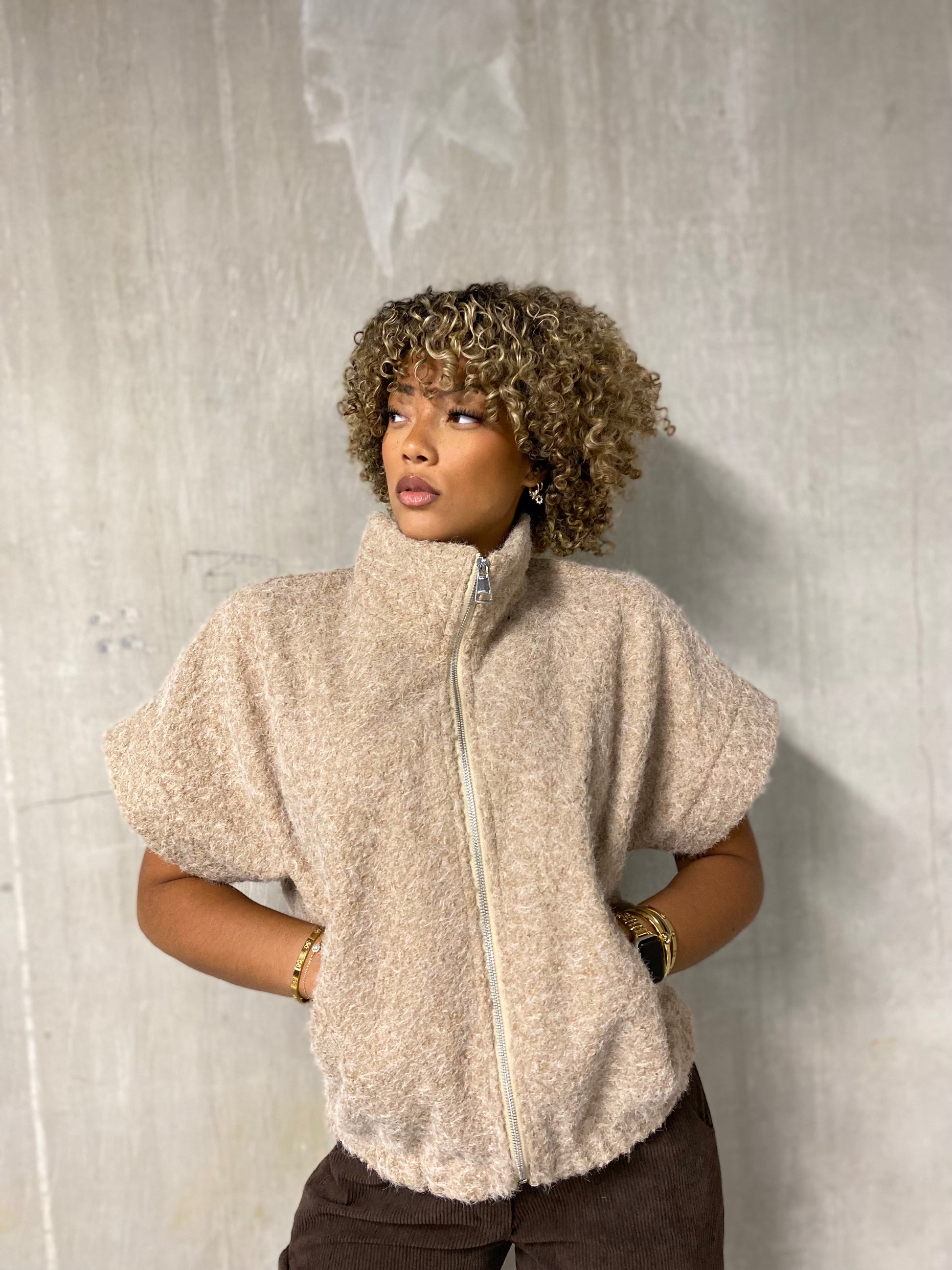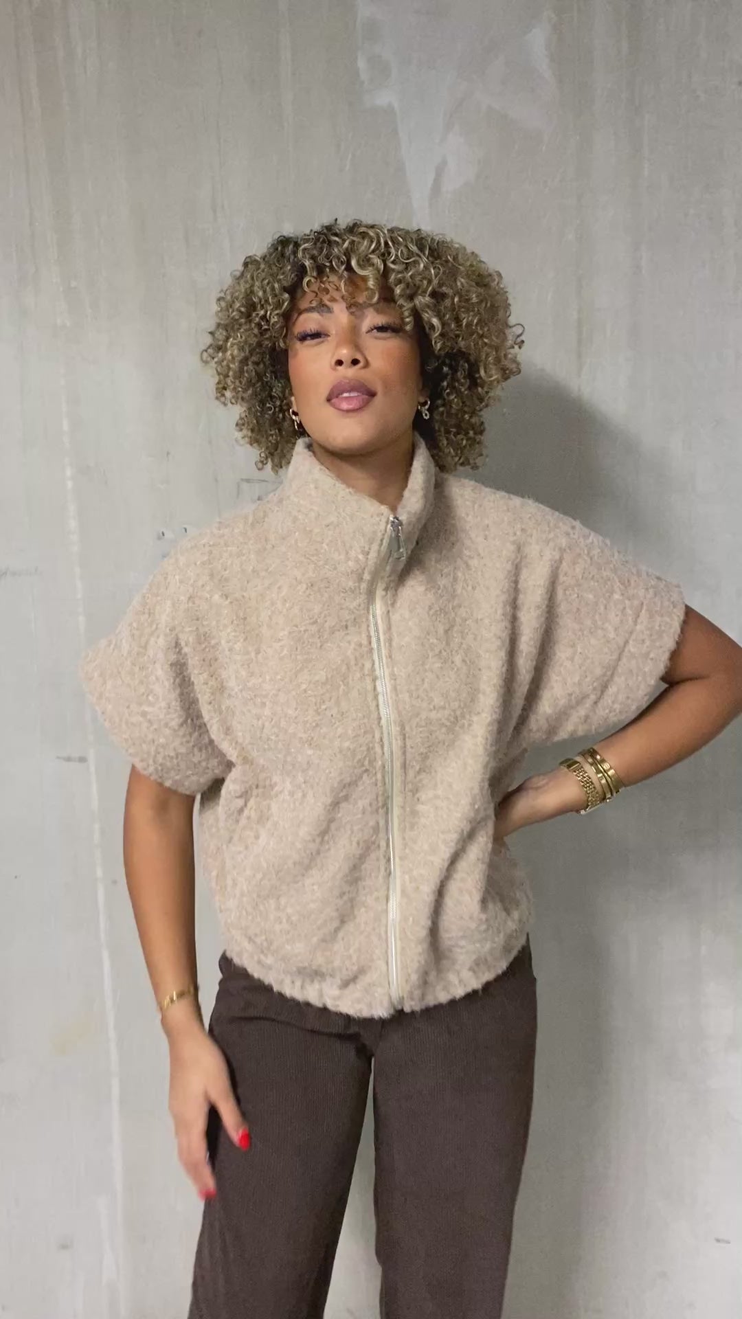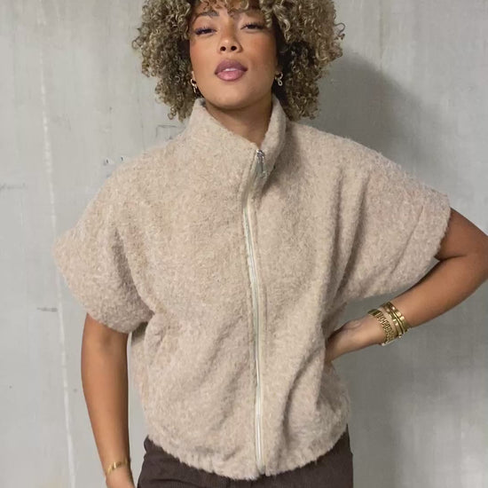 Veste en matière feutrine, laine bouillie, avec une tirette et deux poches manches courtes