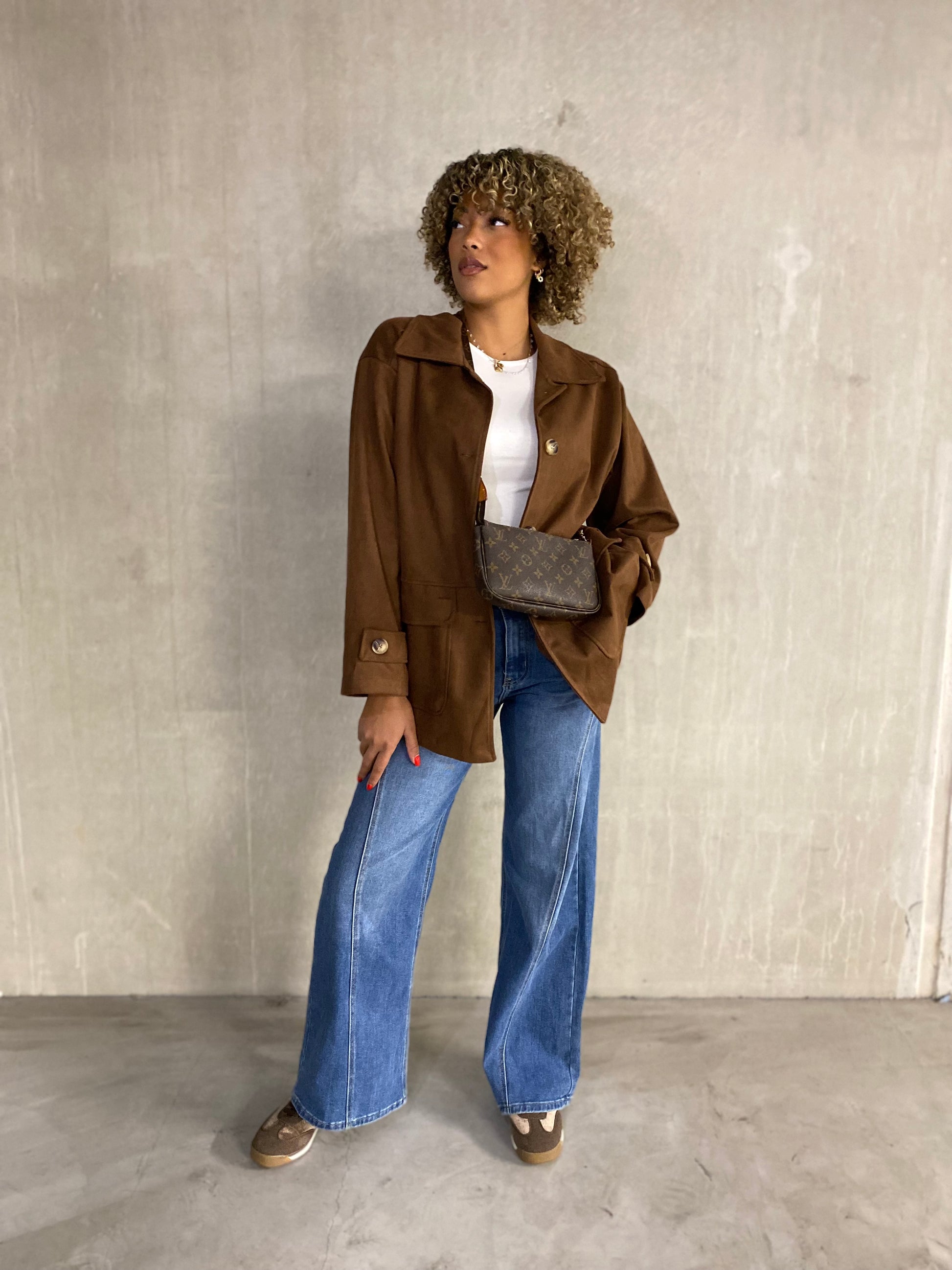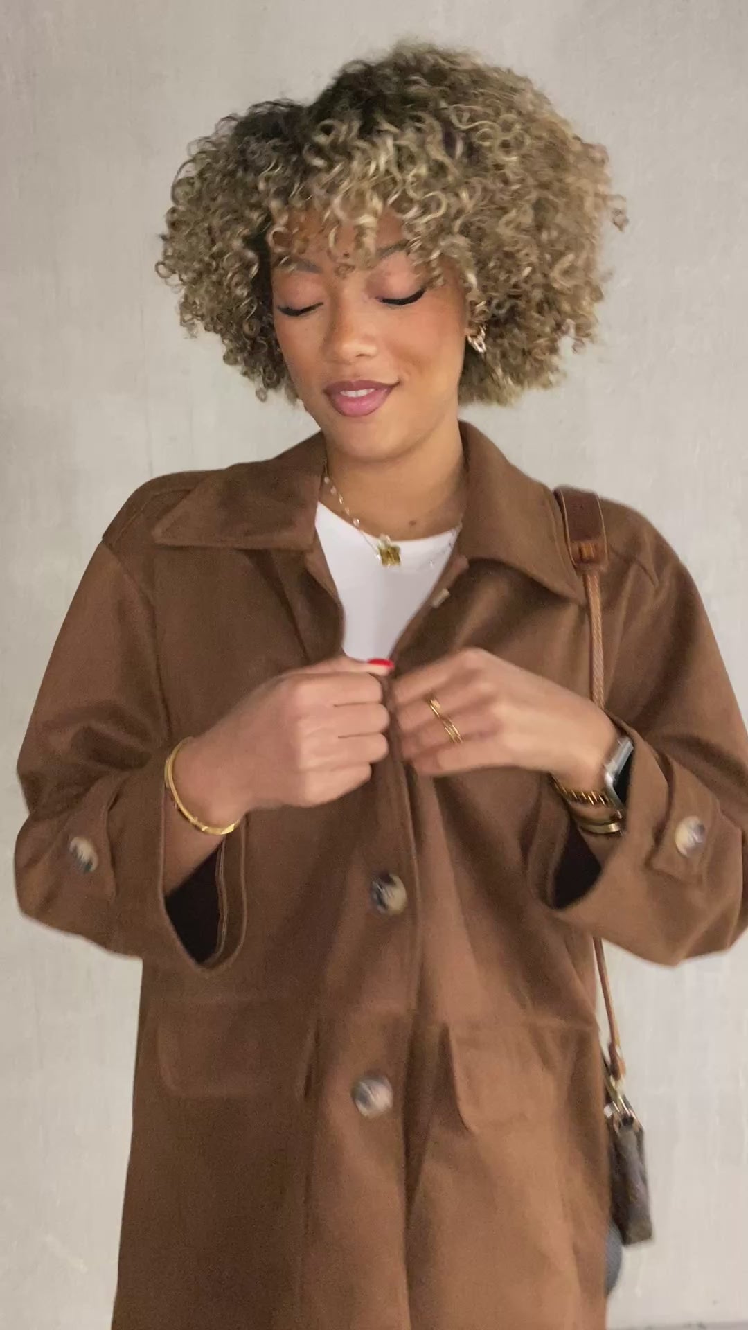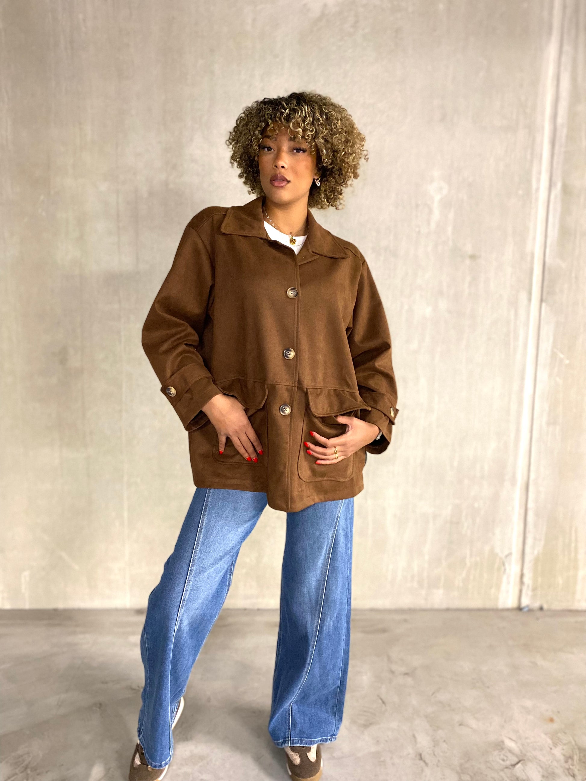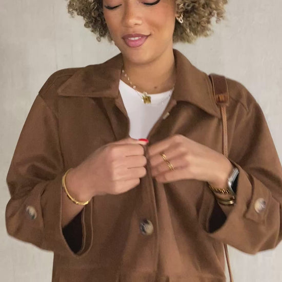 Veste coupe droite avec un col chemise boutonné avec des vraies poches repris avec un bouton au niveau du poignet. La coupe est large over size, elle n'est pas doublée.